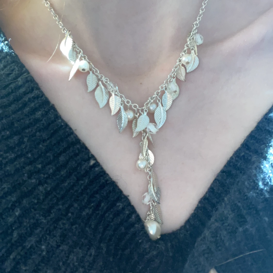 Jättefint halsband i silver med små detaljer som löv och pärlor. Rekommenderar