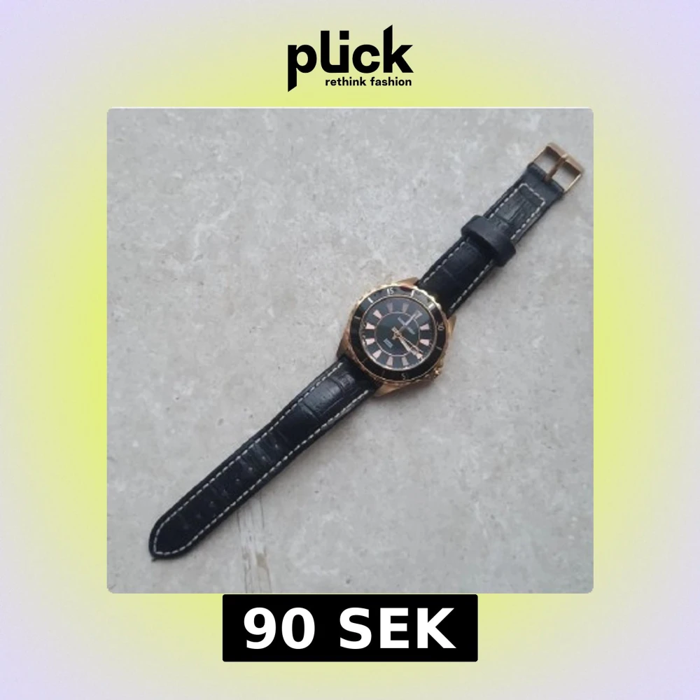 Stilren klocka från det exklusiva danska märket Dyrberg/Kern med svart urtavla och guldfärgad boett. Klockan har svart läderarmband med vita sömmar och klassisk spännesstängning. Urtavlan har guldiga markeringar och detaljer. Gjord av rostfritt stål och kan även visa datumet. Behövs köpas ett nytt batteri.