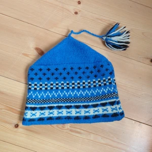 Blå stickad mössa köpt på secondhand, tror den är hemmagjord. Väldigt fint skick och supervarm! Säkert Ull.