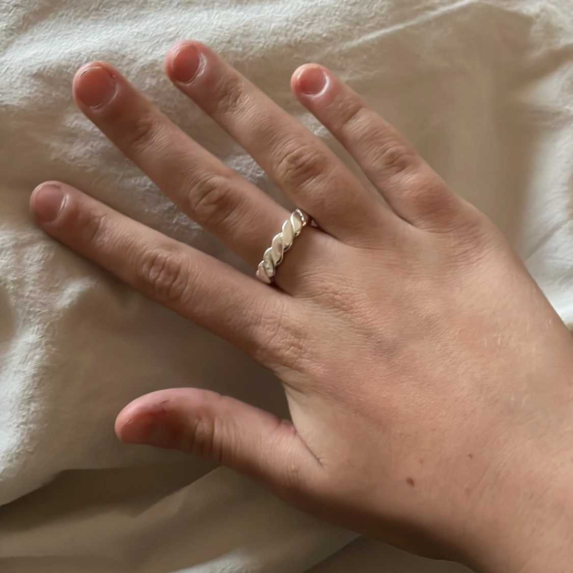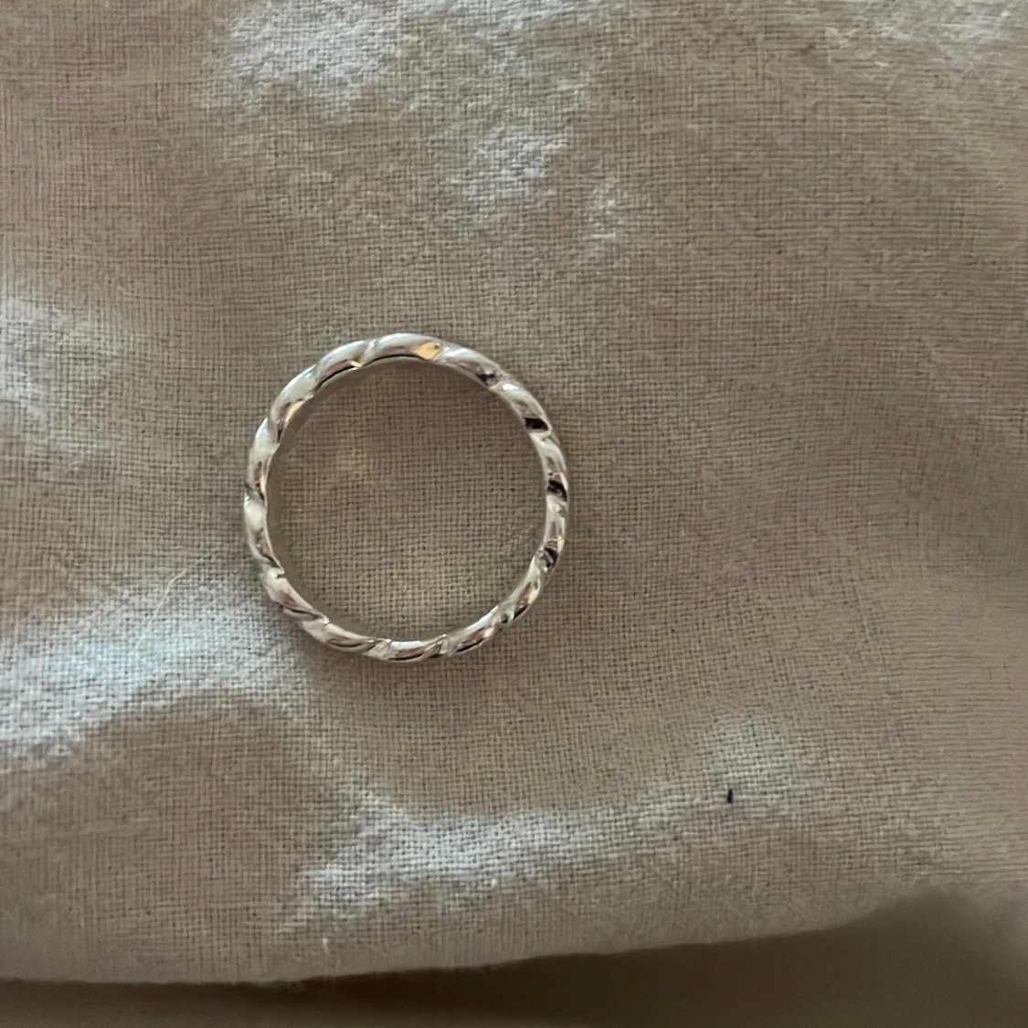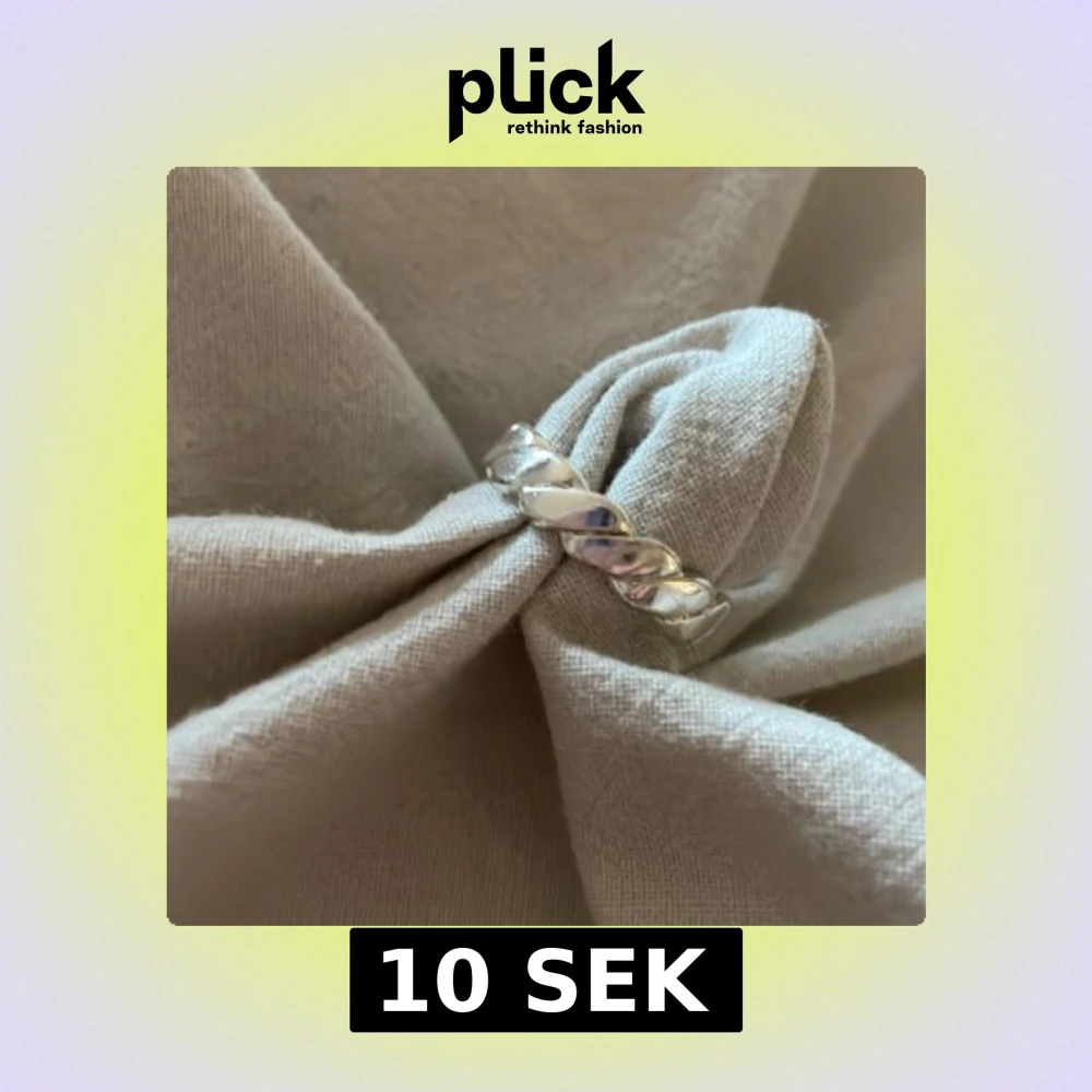 Säljer en snygg ring i silver med flätad struktur runt hela ringen. Den har en blank finish och passar perfekt för dig som gillar minimalistiska och trendiga smycken. Ringen är rund och har en cool twistad look som gör den unik.