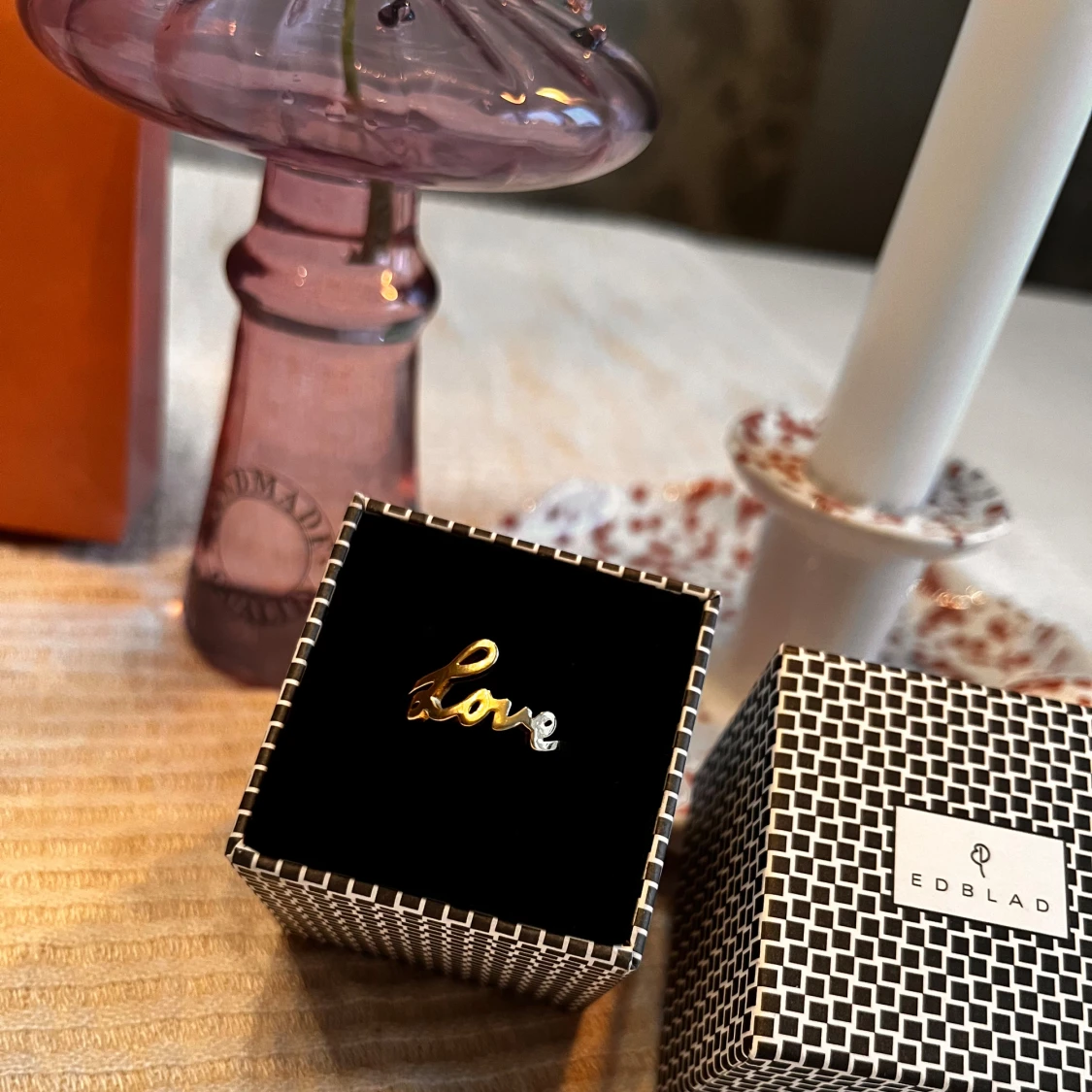 Ring från Edblad det står ”Love” på den och den är i guld Nyskick, om du vill ha den i en Edblad låda kostar det 15kr extra + frakt