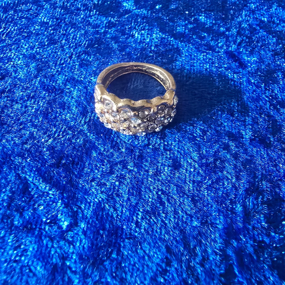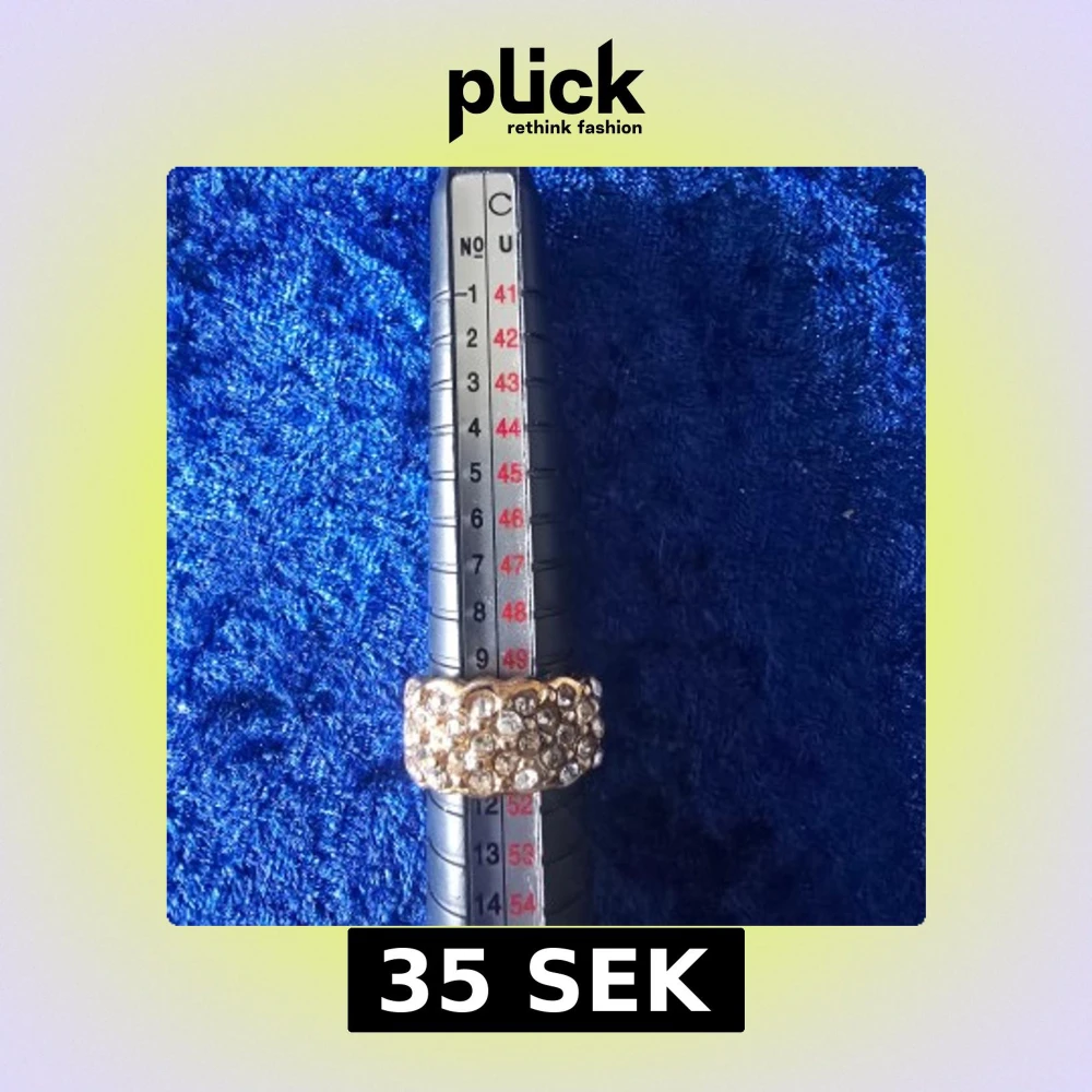 Snygg bred guldfärgad ring med glittriga stenar över hela ovansidan. Ringen har en vågig kant och är riktigt iögonfallande med sina många klara stenar som ger extra bling. Perfekt för dig som gillar att sticka ut med accessoarer.