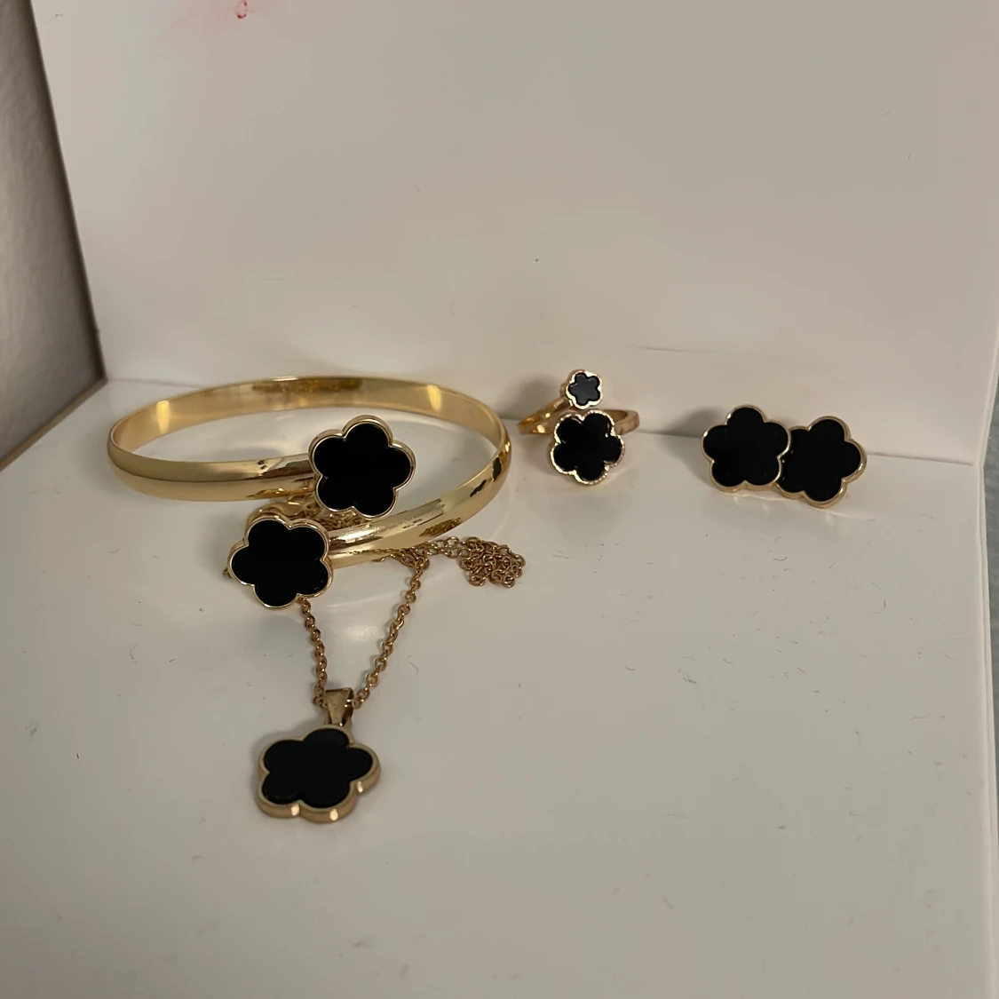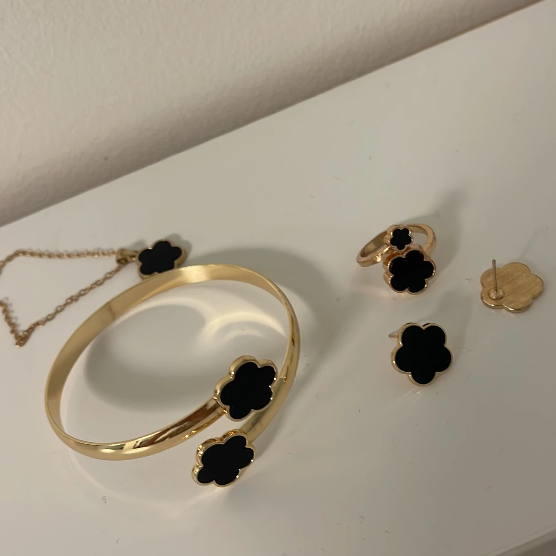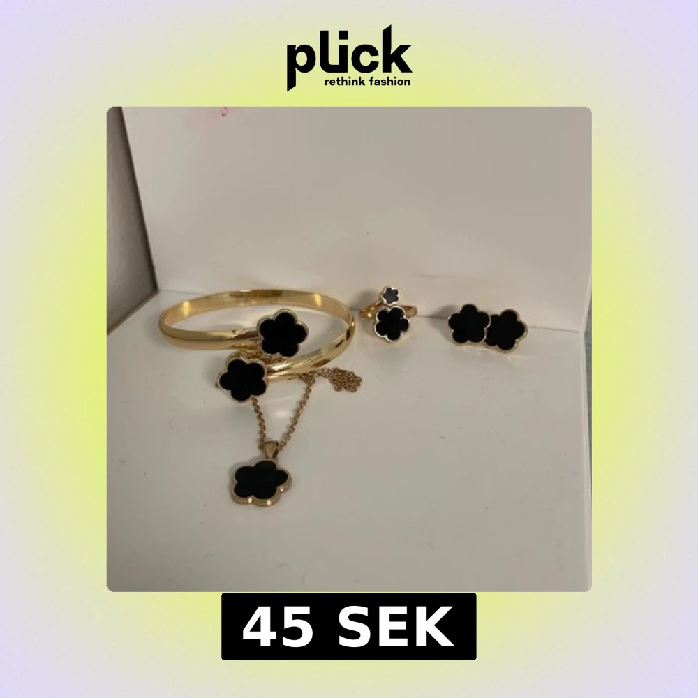 Säljer ett snyggt smyckeset med armband, halsband, ring och örhängen i guldton med svarta blommor. Alla delar har en stilren blomformad design som ger en cool och modern vibe. Perfekt för dig som gillar att sticka ut med detaljer. Helt ny