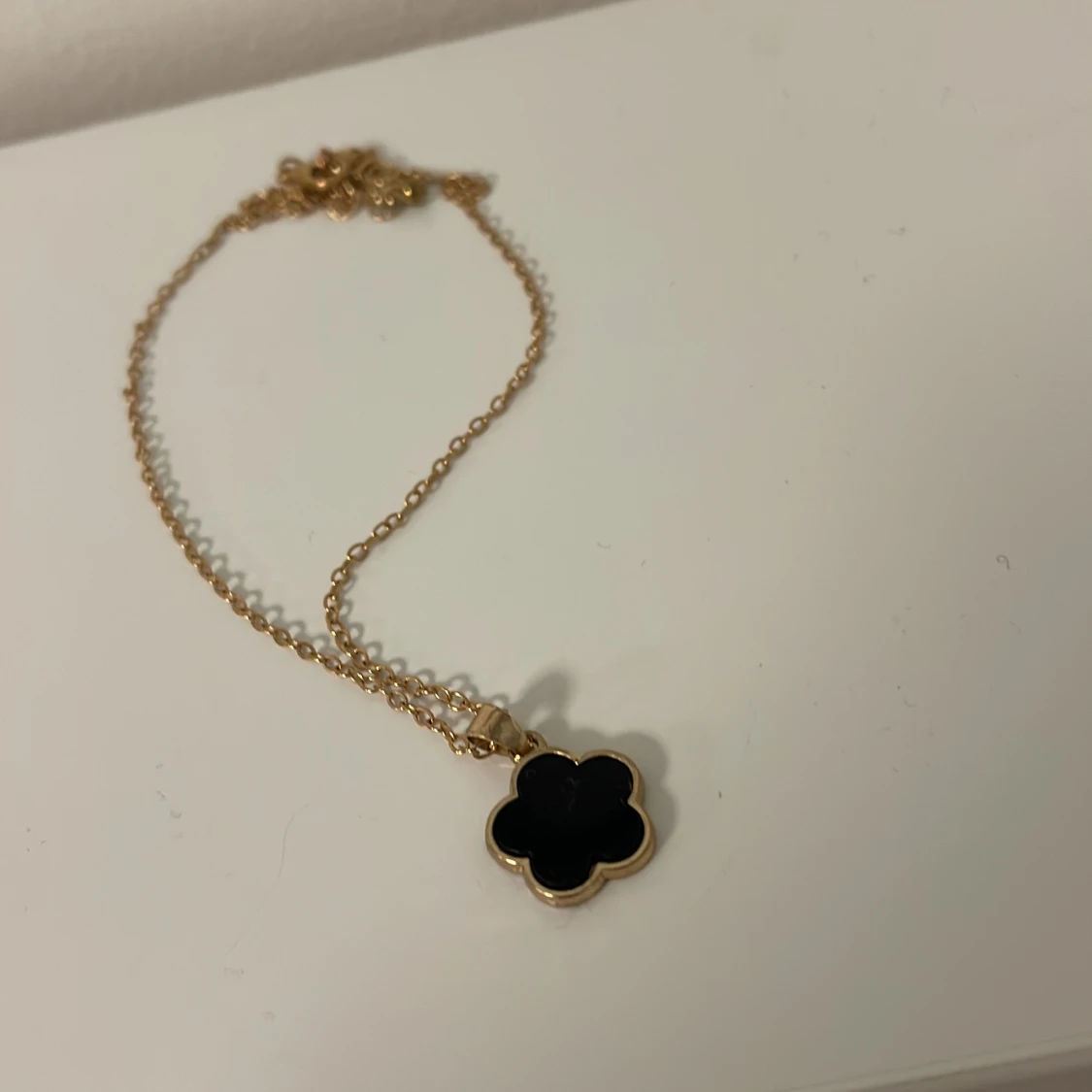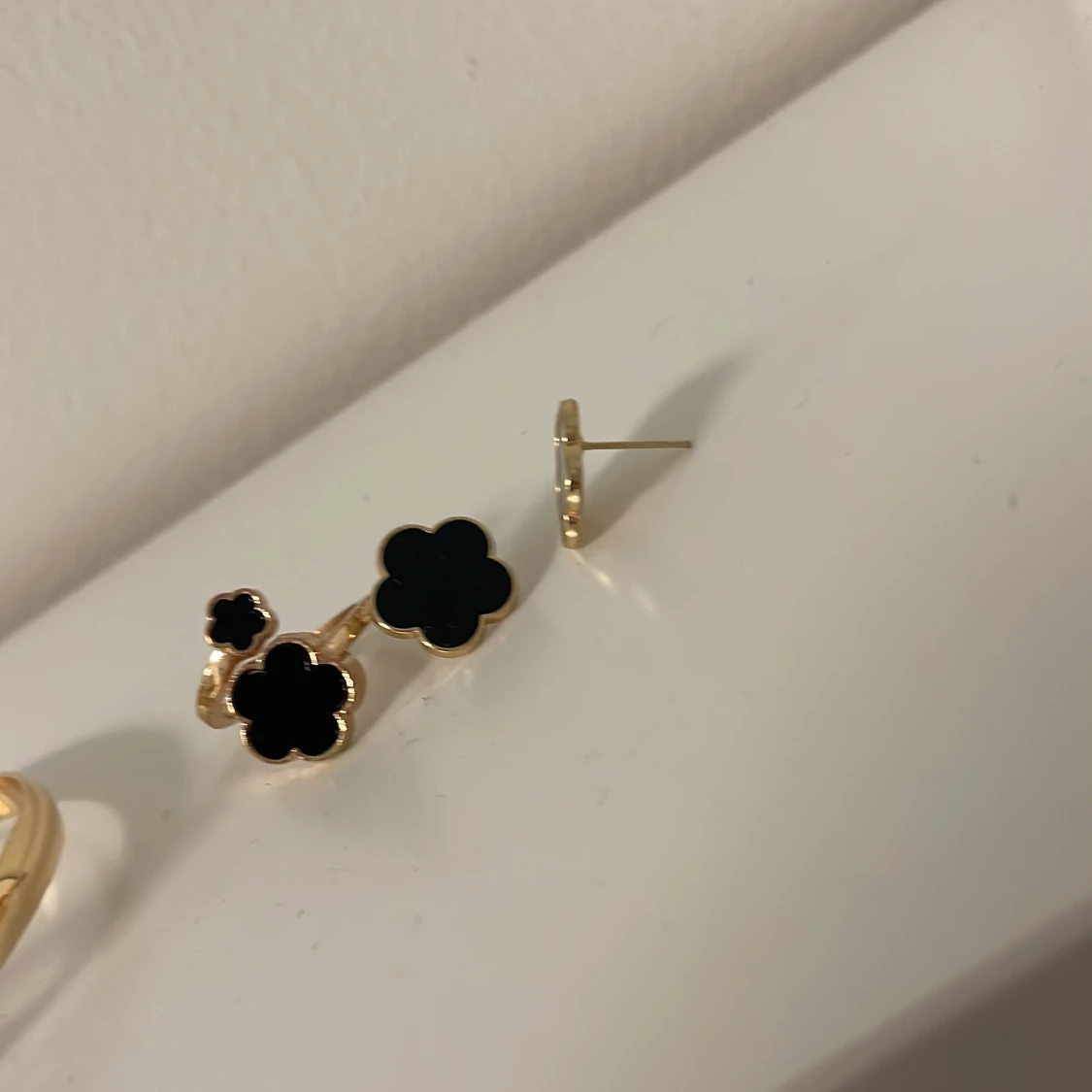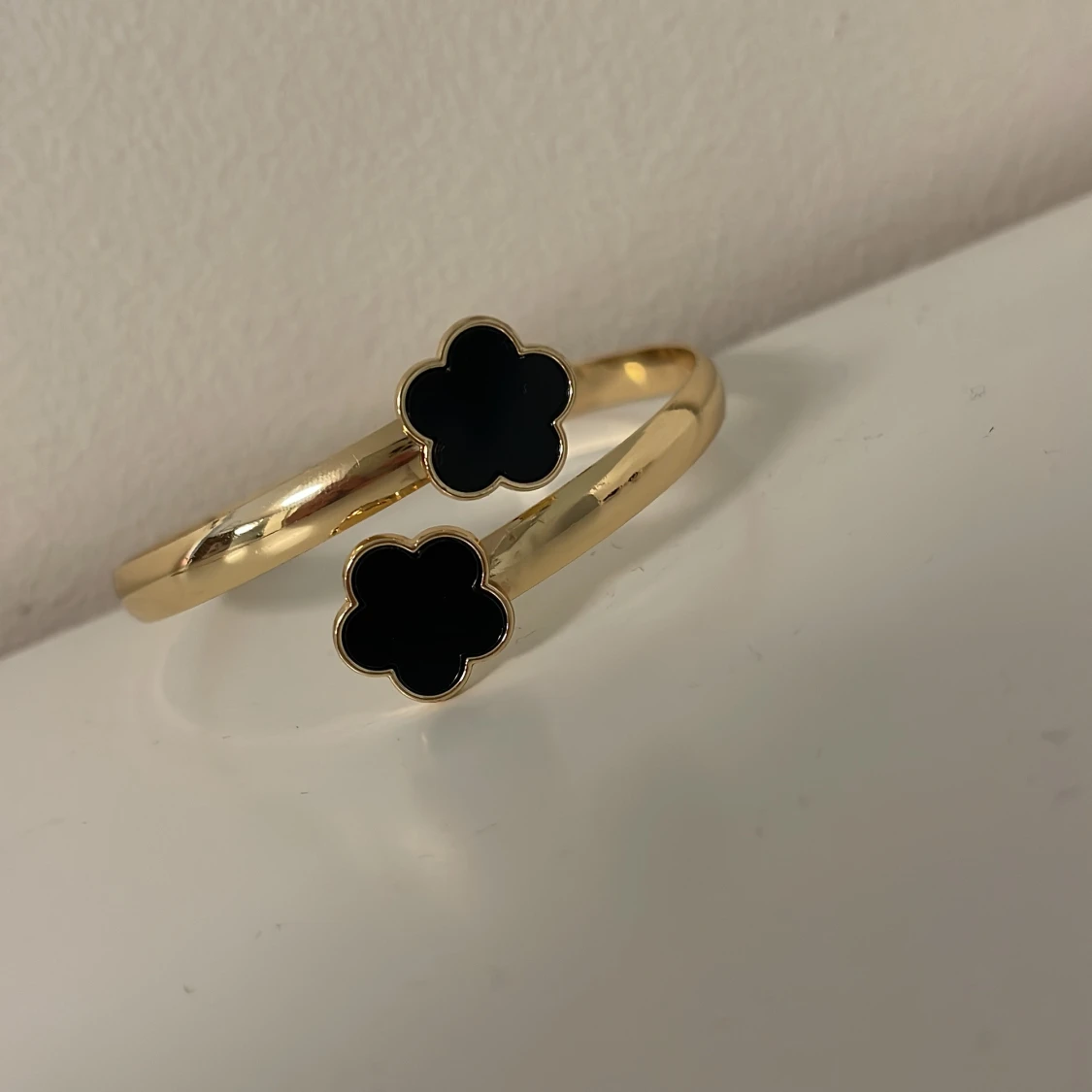 Säljer ett snyggt smyckeset med armband, halsband, ring och örhängen i guldton med svarta blommor. Alla delar har en stilren blomformad design som ger en cool och modern vibe. Perfekt för dig som gillar att sticka ut med detaljer. Helt ny