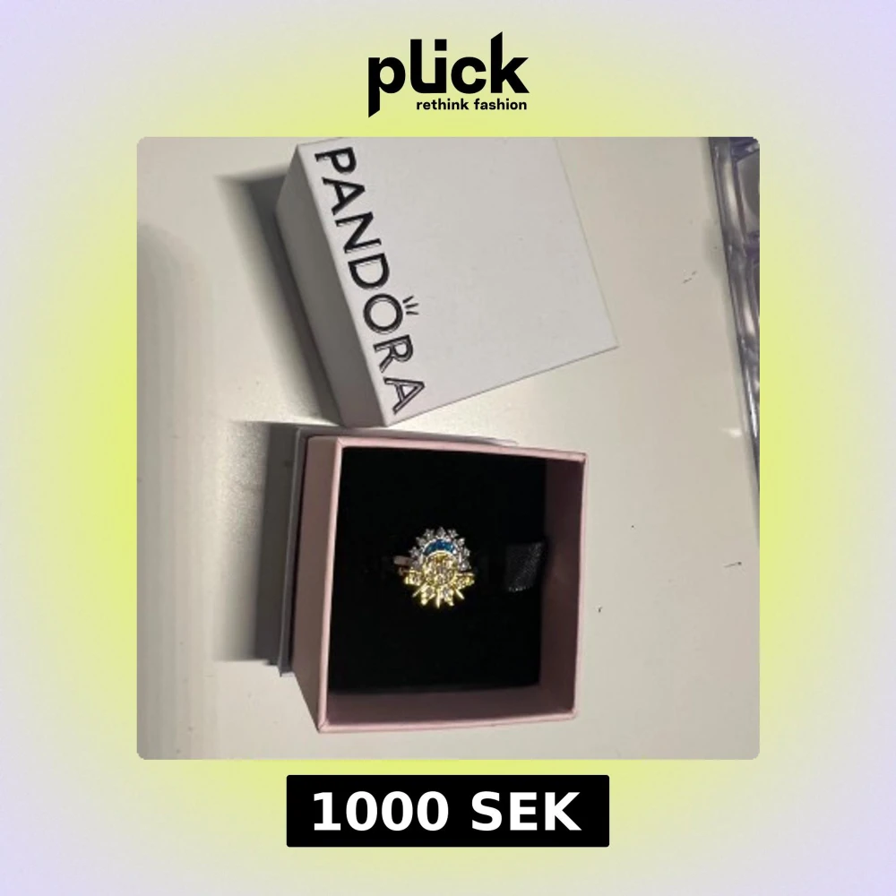 Unik ring från Pandora med en vacker sol- och måndesign. Ringen har detaljer i guld och silver samt gnistrande stenar i blått och klart. Perfekt för att lägga till en touch av elegans och mystik till din stil.