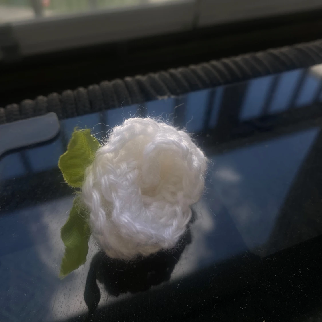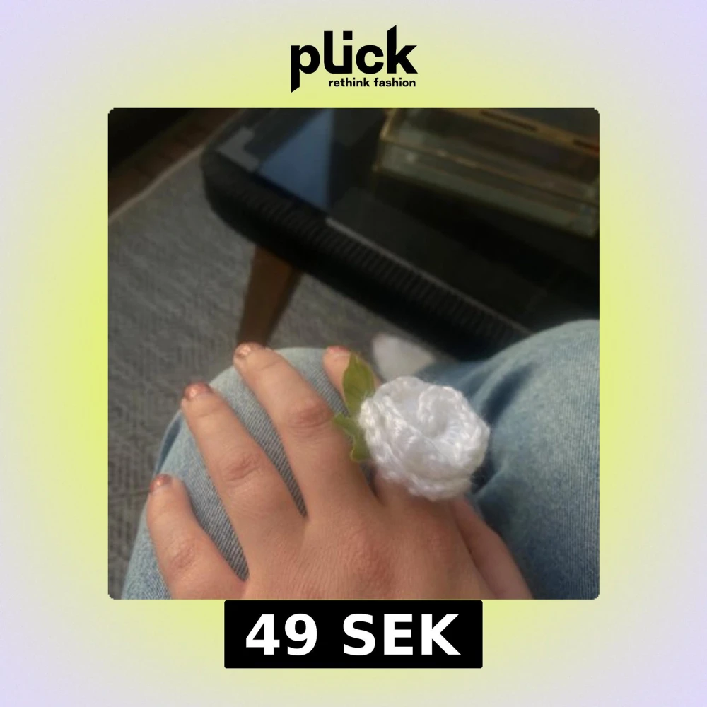 Unik ring med en handvirkad vit ros och gröna tygblad. Ringen har en justerbar metallbas i silverfärg och blomman är fluffig och mjuk, perfekt för dig som letar efter cool accessoar!!