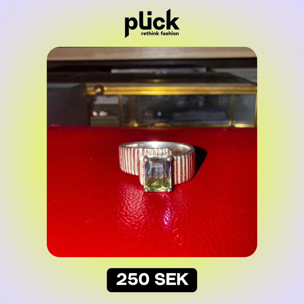 Säljer en snygg silverring med en stor rektangulär sten i mitten. Ringen har en räfflad design som ger den en unik look. Perfekt för både vardag och fest! Stämpel på insidan visar att den är i äkta silver.