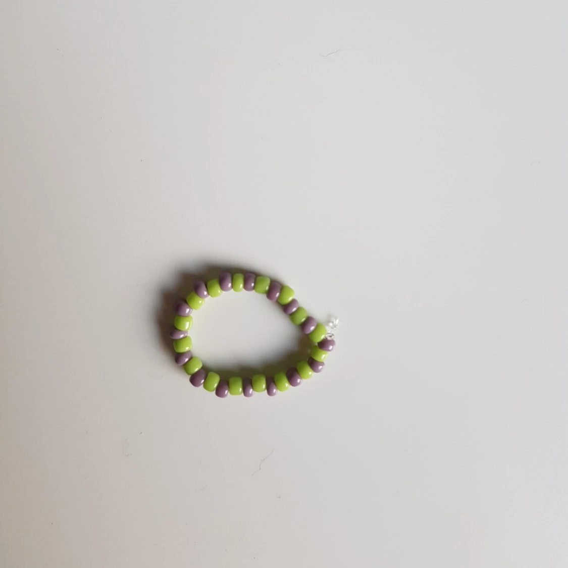 Lila och grön pärlring som är såklart också handgjord. Precis som alla andra smycke går det fint att önska vilka färger man vill ha eller inte vill ha med.