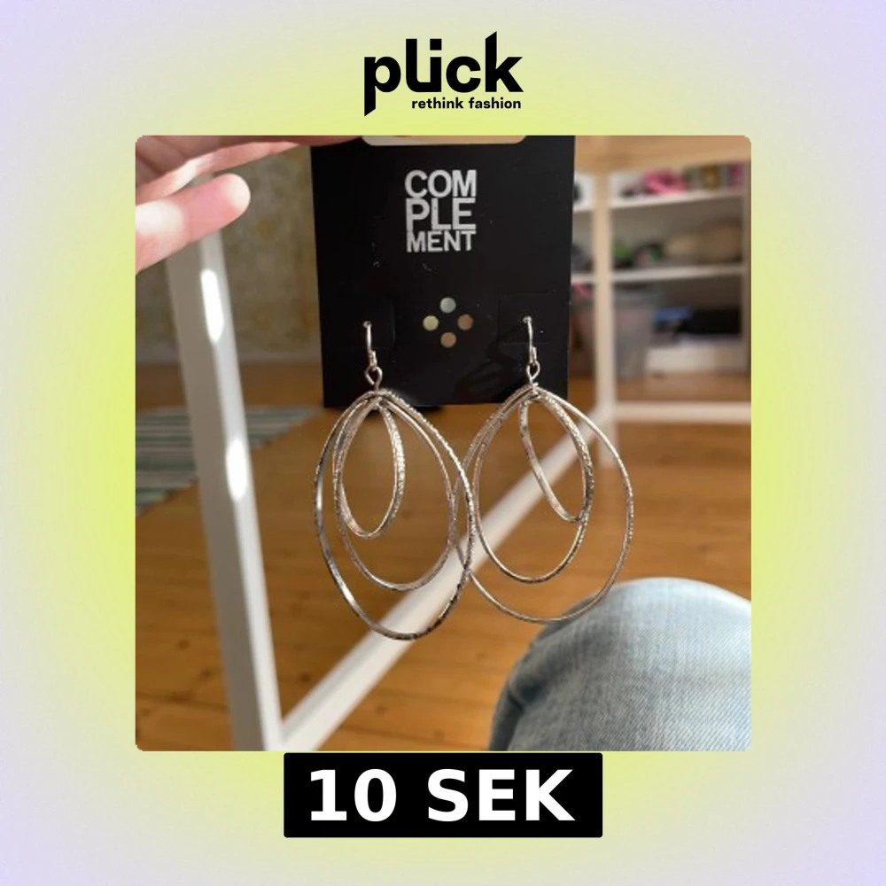 Säljer ett par stora, statement örhängen i silverfärgad metall från Complement. Örhängena har flera ovala ringar i olika storlekar som hänger i lager och ger en cool, modern look. Perfekta för dig som vill sticka ut och addera lite edge till din outfit.