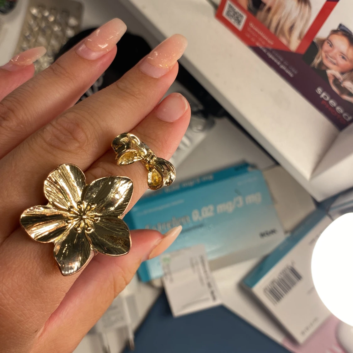 En fin Blom ring och en rosett ring, guld, superfina och passar perfekt till fina tillfällen. Justerbara ❣️