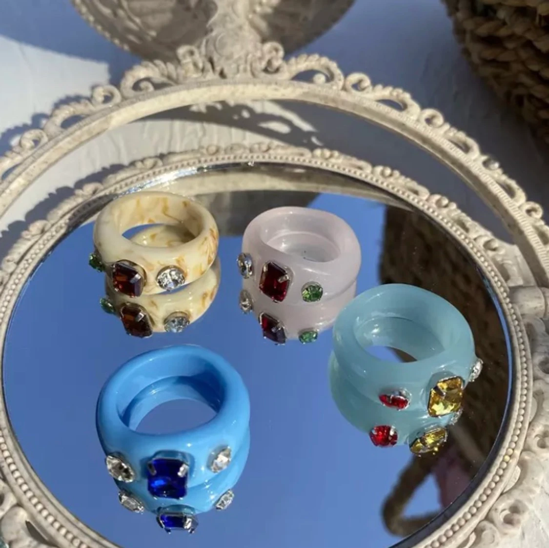 ALLA FINNS KVAR TILLS ANONSEN ÄR BORTAGEN) Coola ringar i plast med diamanter, finns i färgerna mörkblå, ljusblå, rosta och benvit. Eftersom de är gjorda i plast kommer de inte att rosa, de går till och med att bada med! Skickar samma dag som du beställer! Pris: 129kr styck 💙🤍💗 (frakt ingår i priset!!!!)