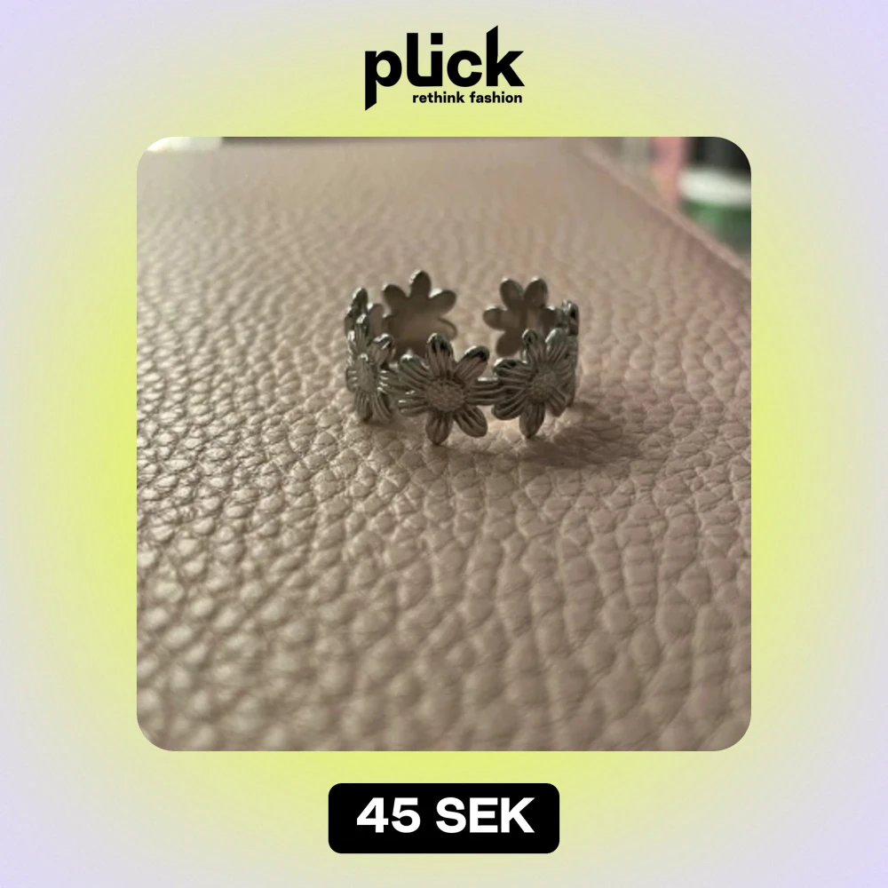En fin ring med blommor, den är inte äkta men står att den är rostfritt stål. Juster bar vilket gör det lätt att göra större och mindre. Och kan passa på flera! Säljer då den inte kommer till användning.