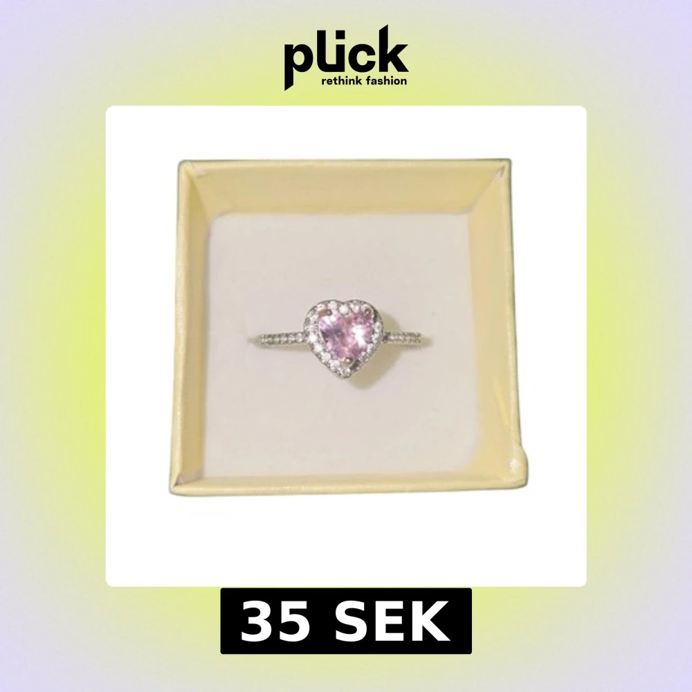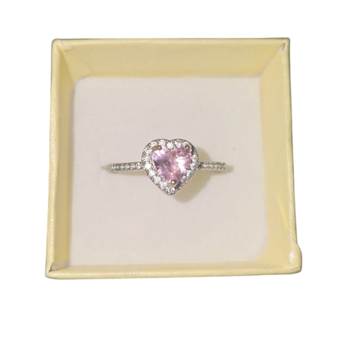 Elegant ring med en hjärtaformad rosa sten i mitten, omgiven av glittrande stenar. Perfekt för att ge en romantisk touch till din stil. US 7.5 eller 17.7 mm, okänt material