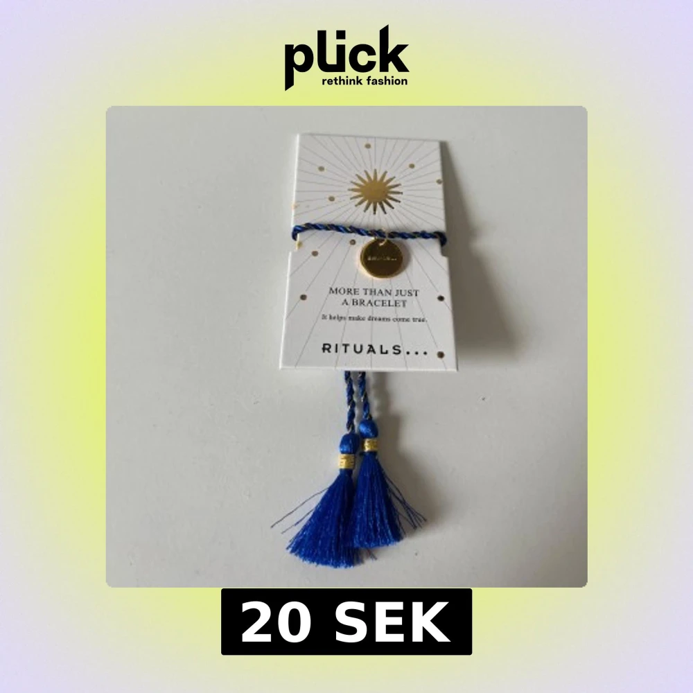 Snyggt armband från Rituals i blått och guld med tvinnad design och två stora tofsar. Armbandet har en rund guldfärgad berlock med Rituals-loggan och detaljer i guld.