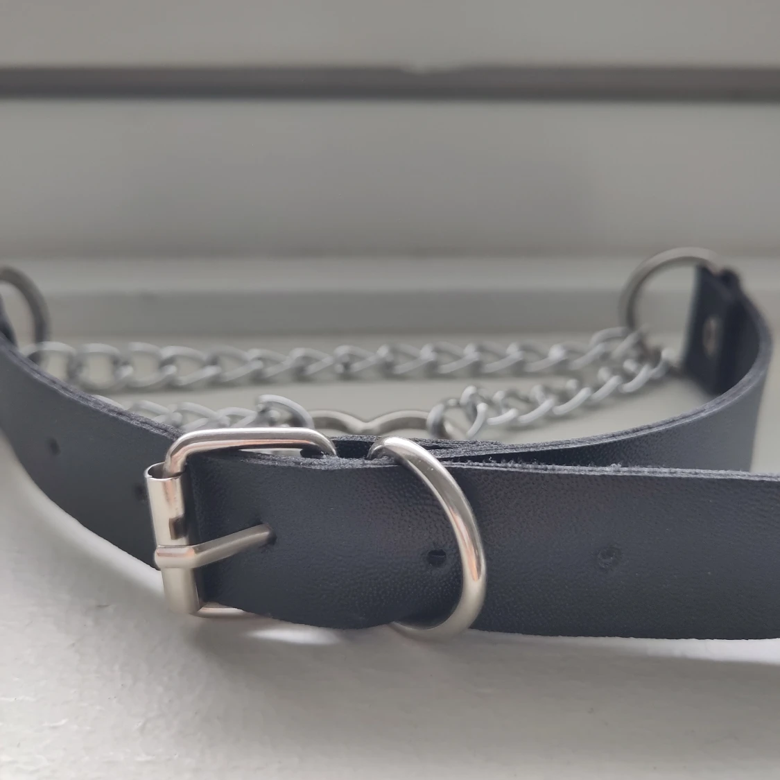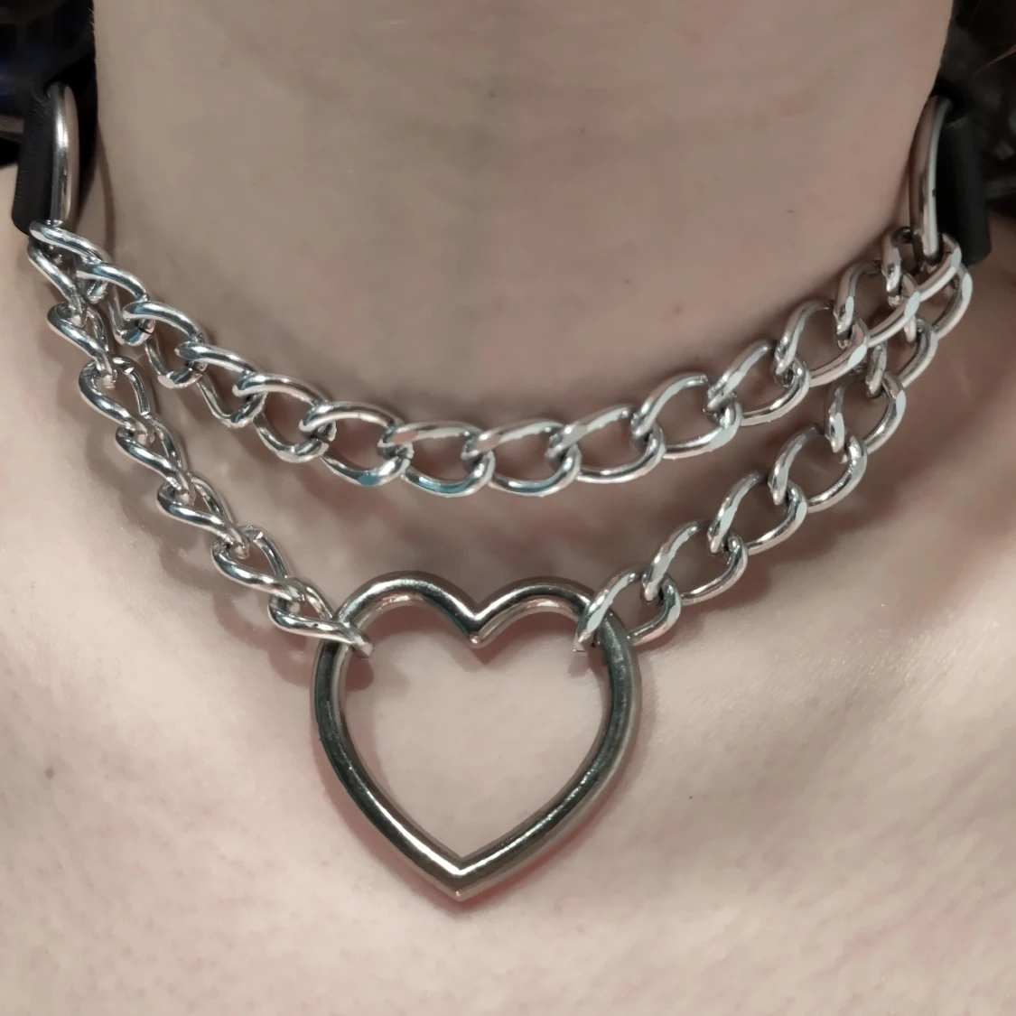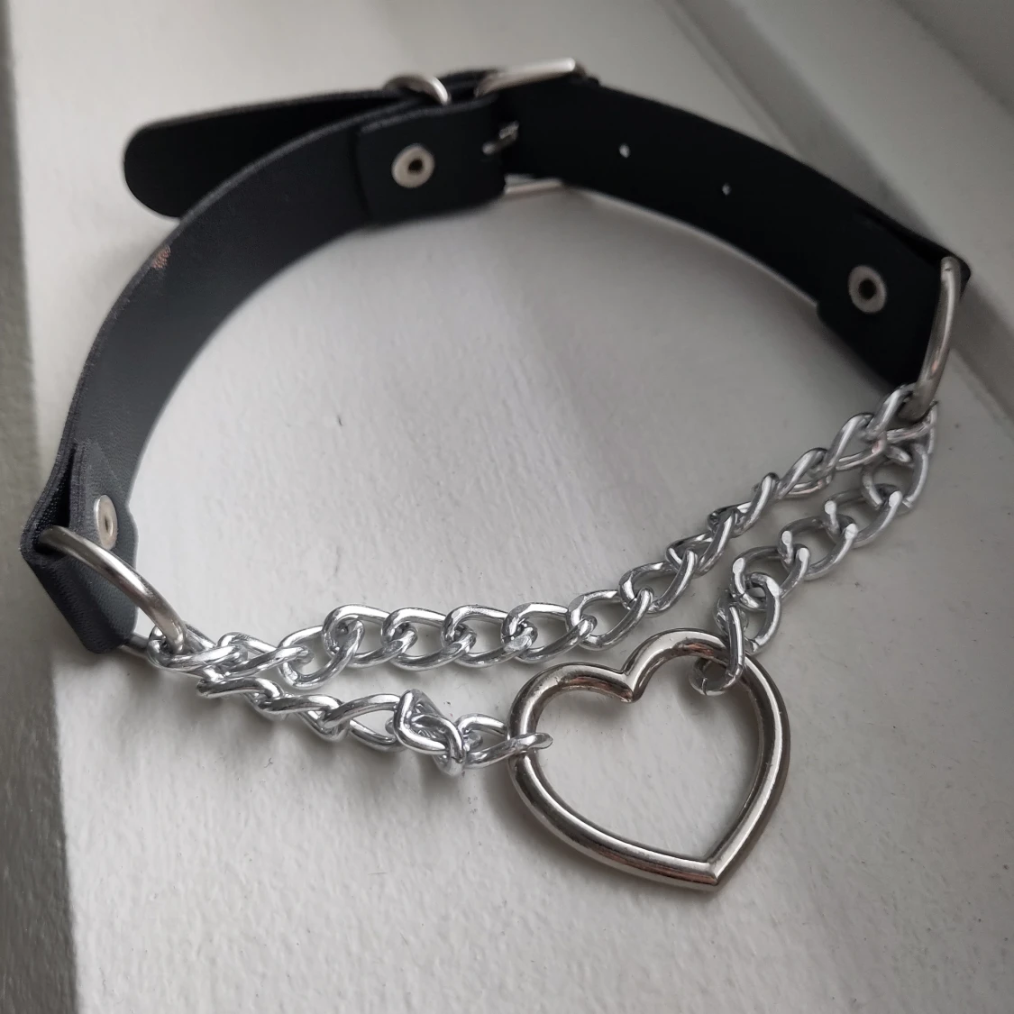 En cool choker med två kedjor och hjärta. Den fästs med remar som ett skärp, och det finns fem stycken hål så den är ganska justerbar. I mycket bra skick!