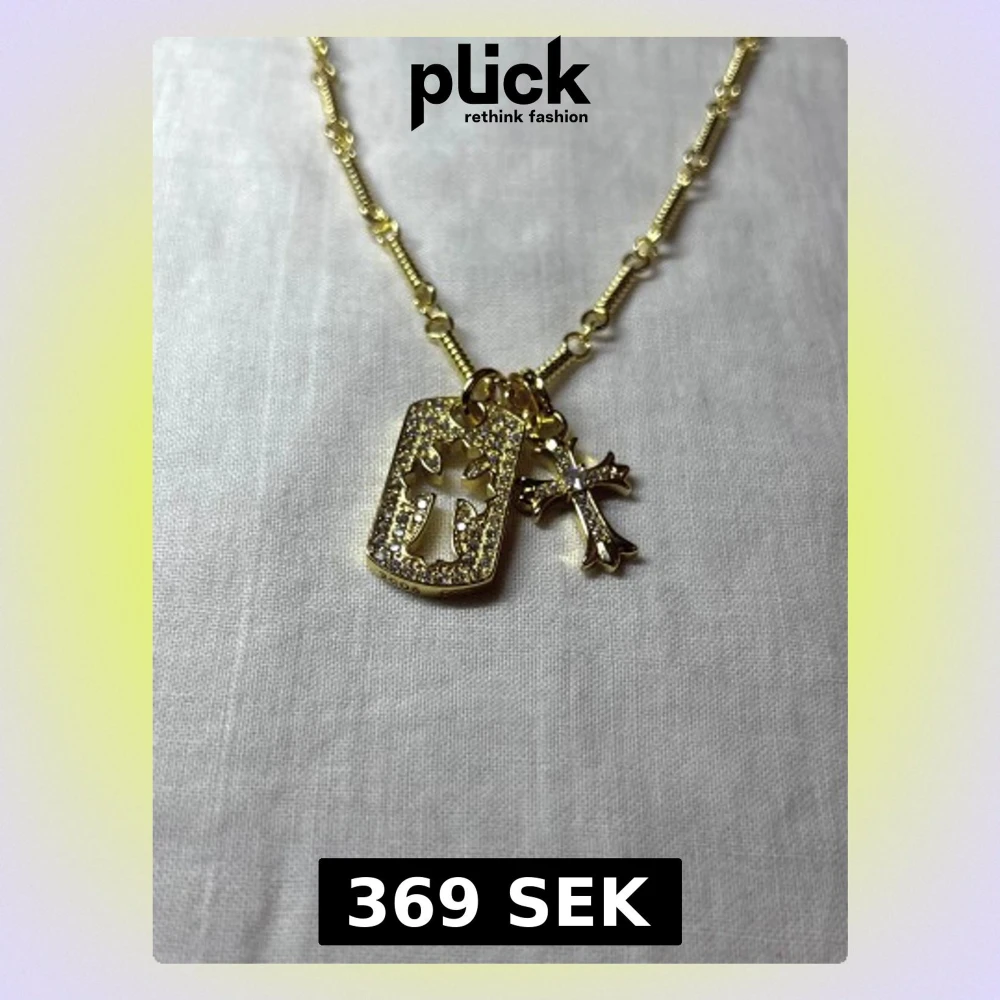 Golden necklace with a sparkling tag (2.4 × 1.4 cm) and cross charm (1.9 × 1.4 cm). 55 cm chain, fully adjustable along its length.