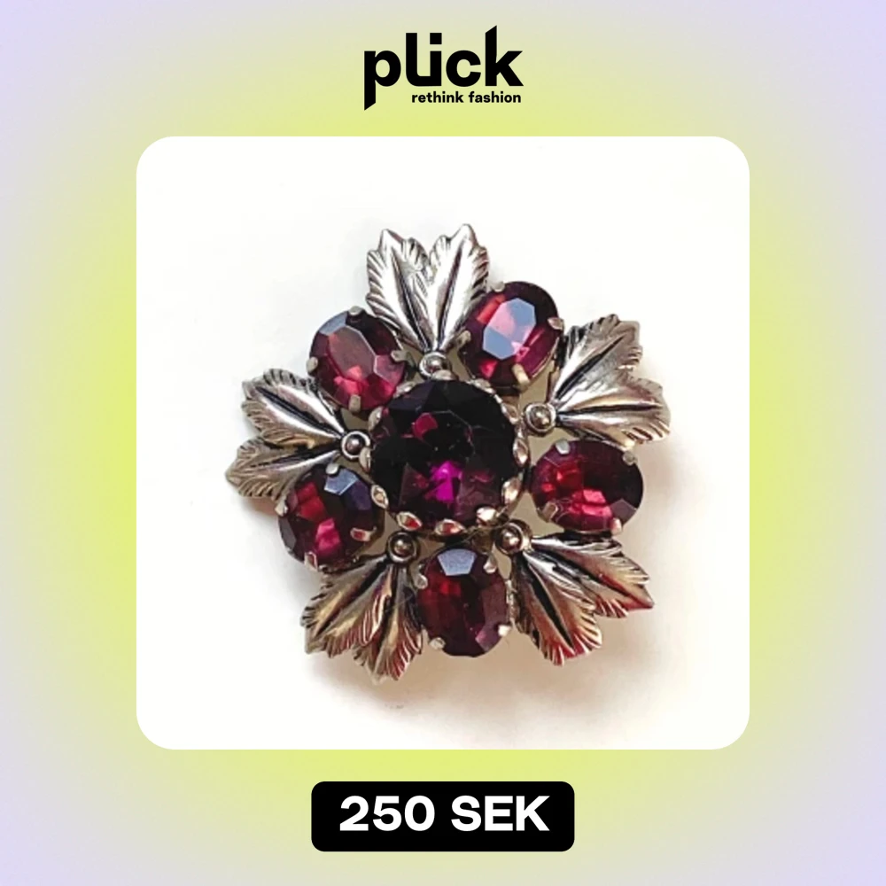 Säljer en superfin vintage brosch med stora, gnistrande lila stenar. Den har detaljerade silverblad som ger en elegant touch. Perfekt för att piffa upp en outfit till fest eller speciella tillfällen. Broschen är ungefär 4 cm i diameter. okänt material