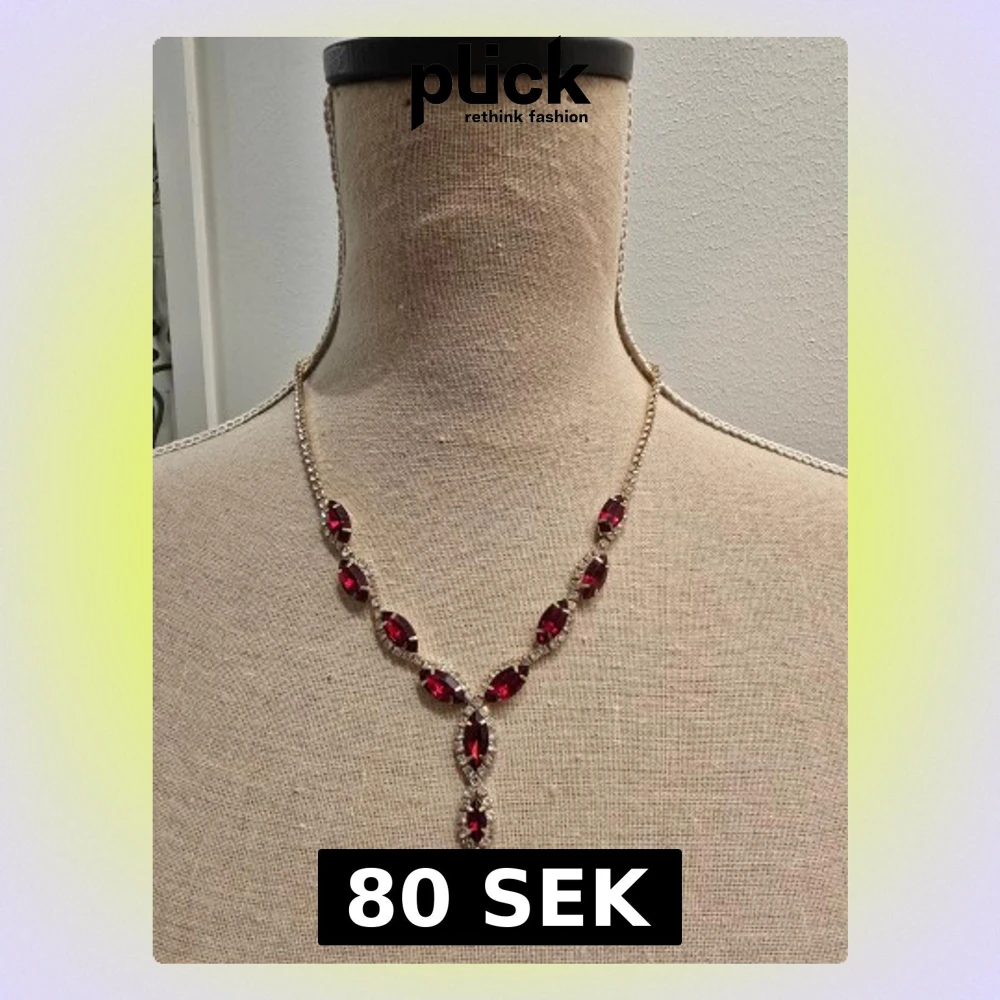 Säljer ett riktigt snyggt halsband med stora röda stenar och glittriga detaljer. Kedjan är guldfärgad och stenarna är formade som droppar, vilket ger en lyxig och elegant vibe. Perfekt för att lyfta vilken outfit som helst.