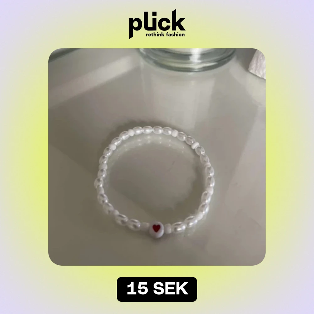 Säljer ett supergulligt armband med vita pärlor och en liten röd hjärtpärla i mitten. Perfekt för att ge en söt touch till din outfit! Passar till alla tillfällen och är one size.