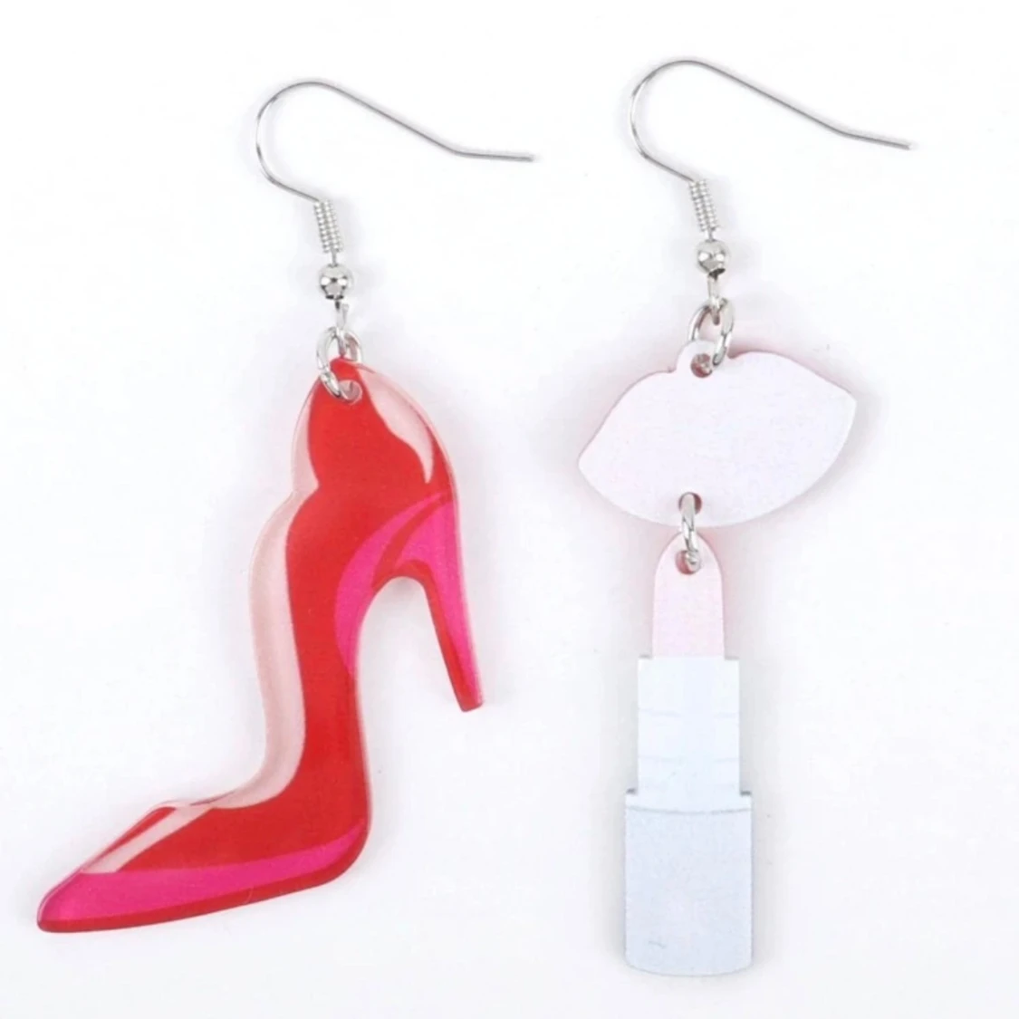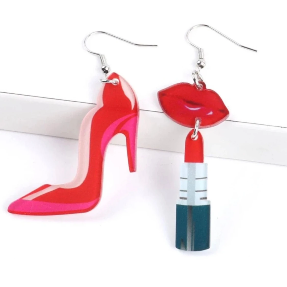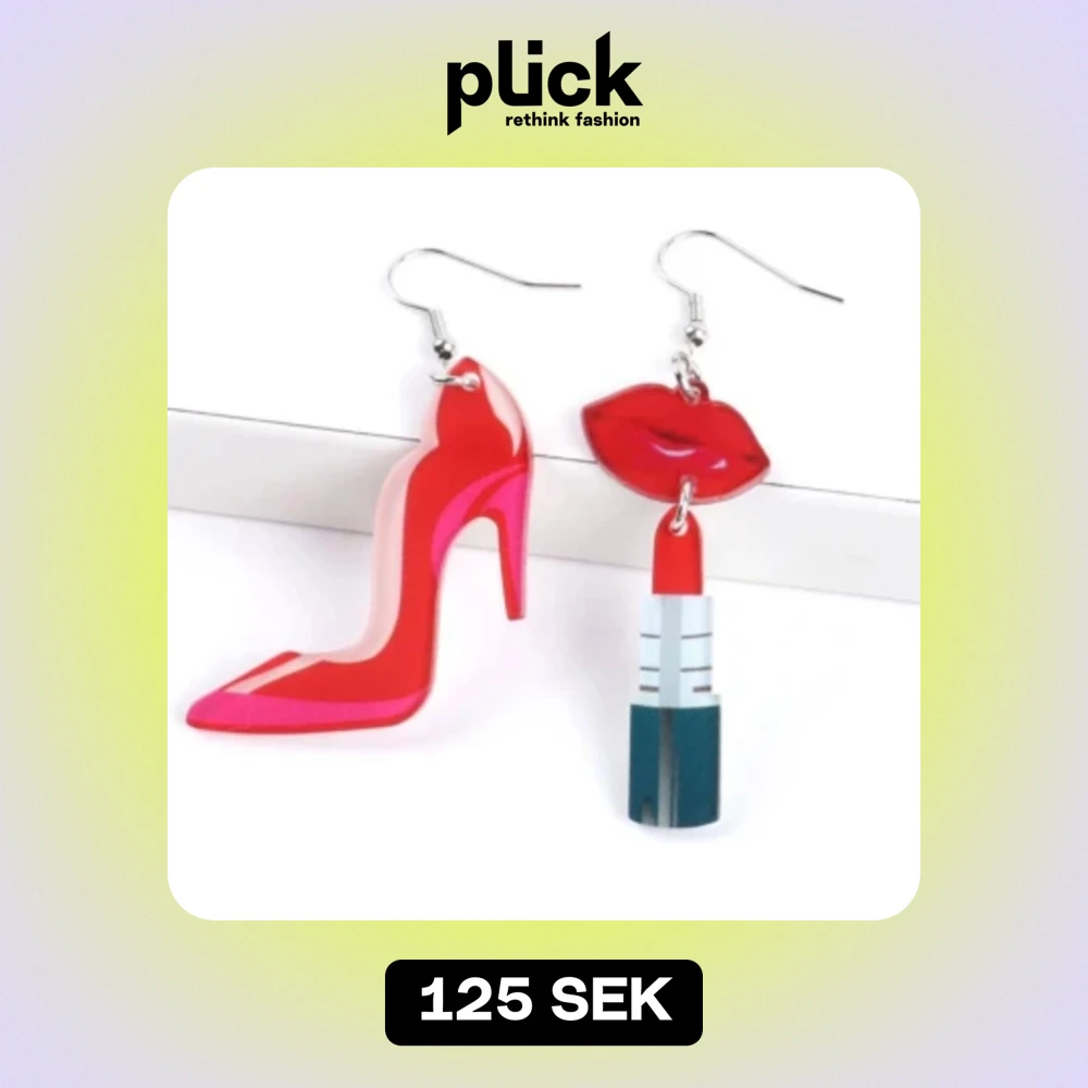 Säljer ett par unika örhängen med motiv av en röd högklackad sko och ett rött läppstift. Skon är knappt 7 cm lång och 2,7 cm bred. Läppstiftet 7,3 cm långt och 2,2 cm brett. Material: rostfritt stål och plast. Lätta att bära.En färgglad, lekfull touch till din outfit och ett solklart blickfång!