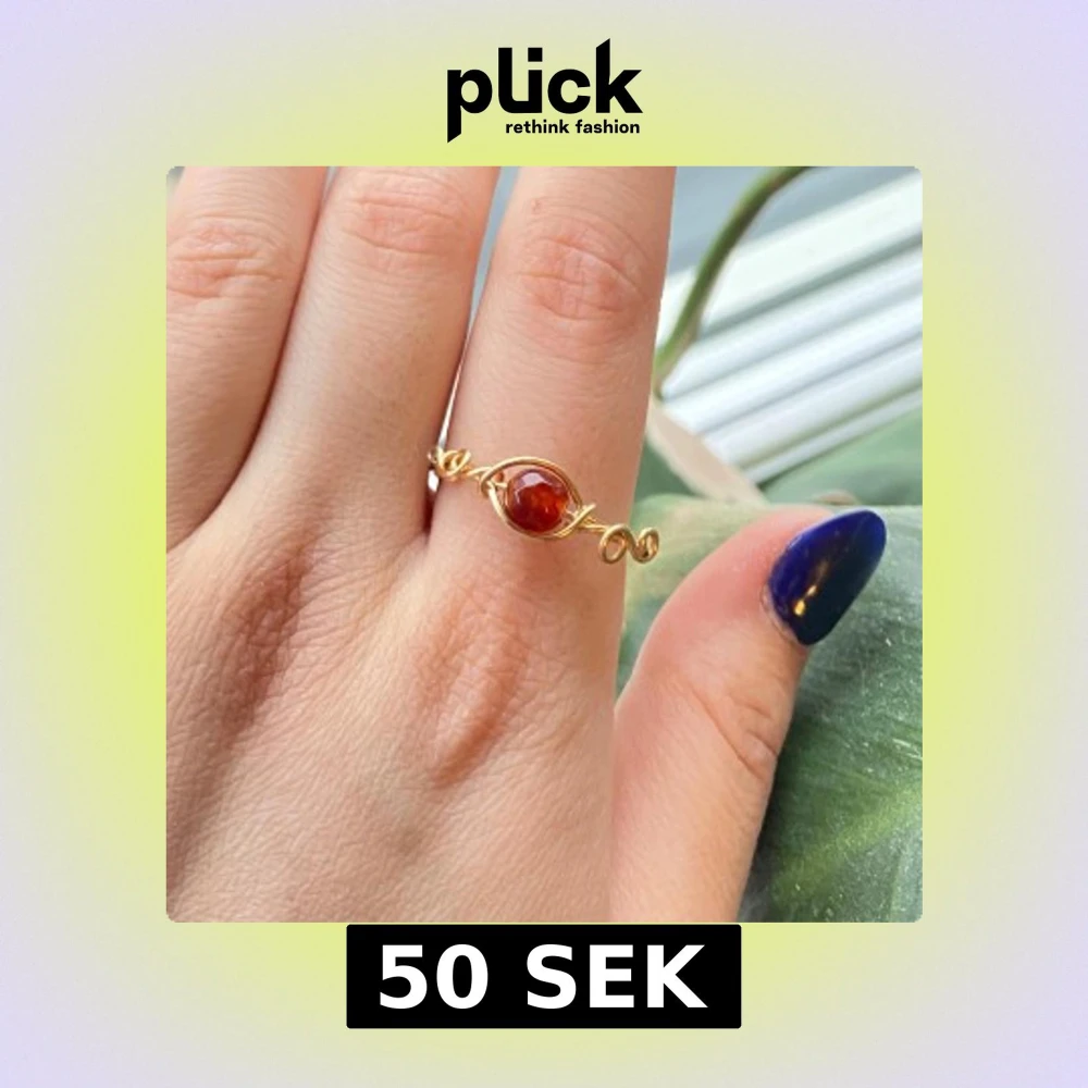 Unik ring i guldpläterad metall med en vackert infattad rund röd sten i mitten. Ringen har en elegant, snirklig design som ger ett bohemiskt och trendigt intryck. Perfekt accessoar för att lyfta din stil.