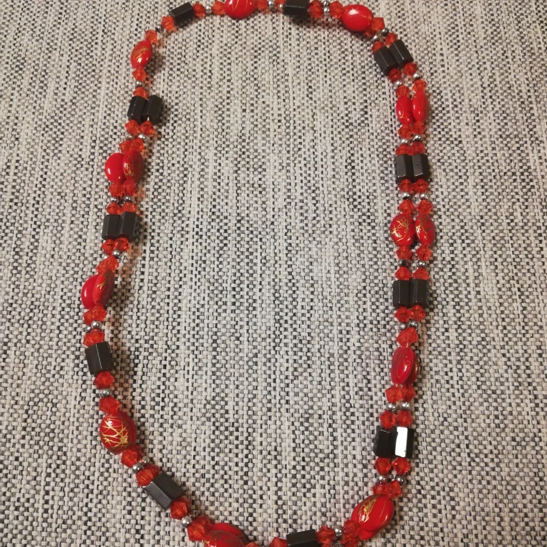 Röd, med svarta magneter, går att använda som halsband, armband och annat. Justerbar storlek. 49 kr+50 kr leverans