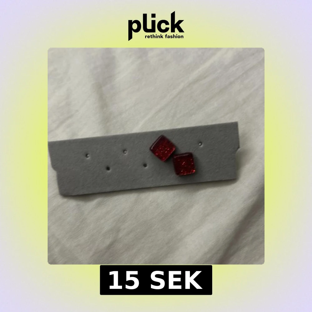Snygga örhängen i form av små fyrkanter med röd glittrig yta. Perfekta för dig som vill ha något som sticker ut och ger lite extra färg till din stil. Stift i metall och cool design som passar till många looks.