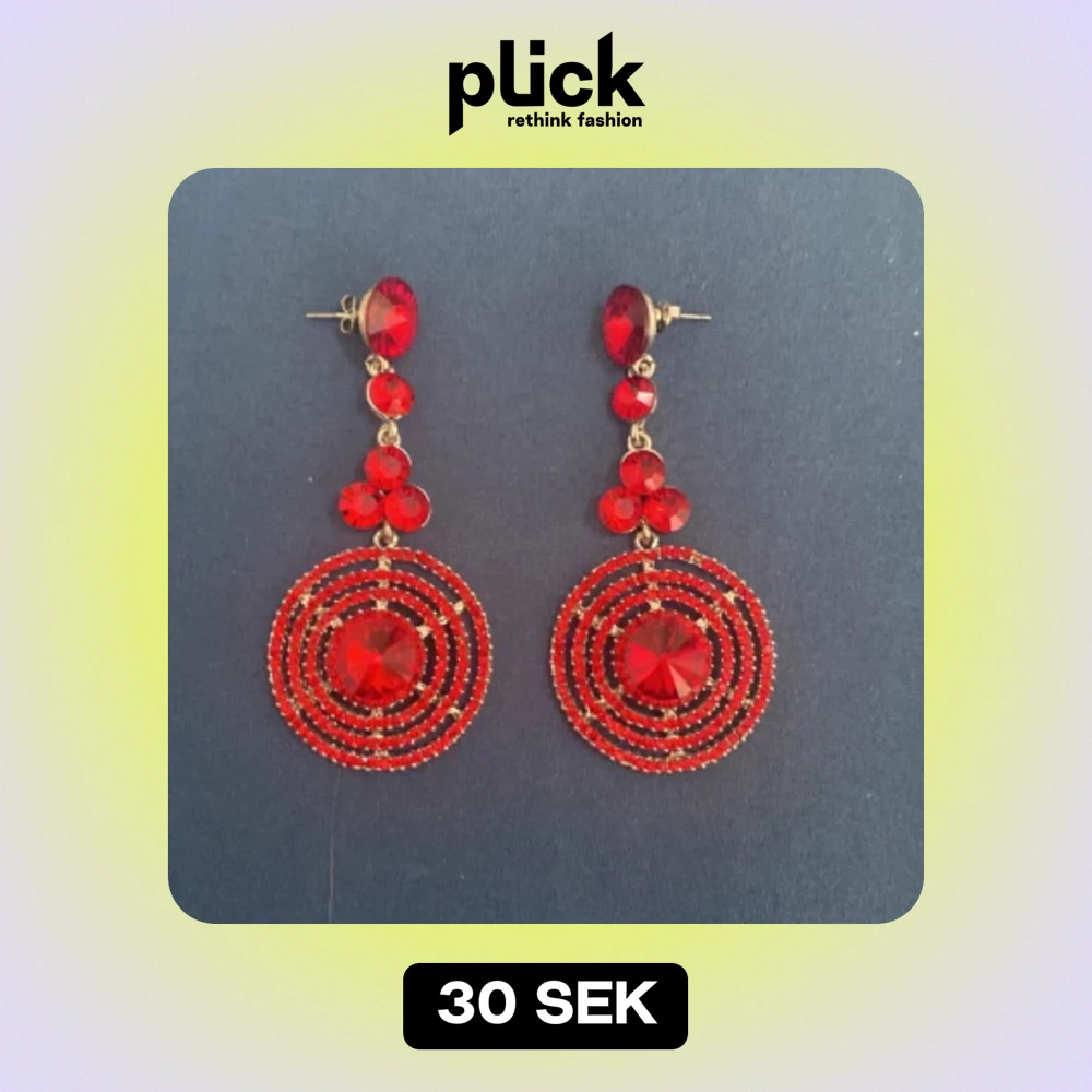 Säljer ett par fantastiska röda glittriga örhängen med stora runda hängen. De har flera små röda stenar som bildar en cirkulär design. Perfekta för att lysa upp vilken outfit som helst!