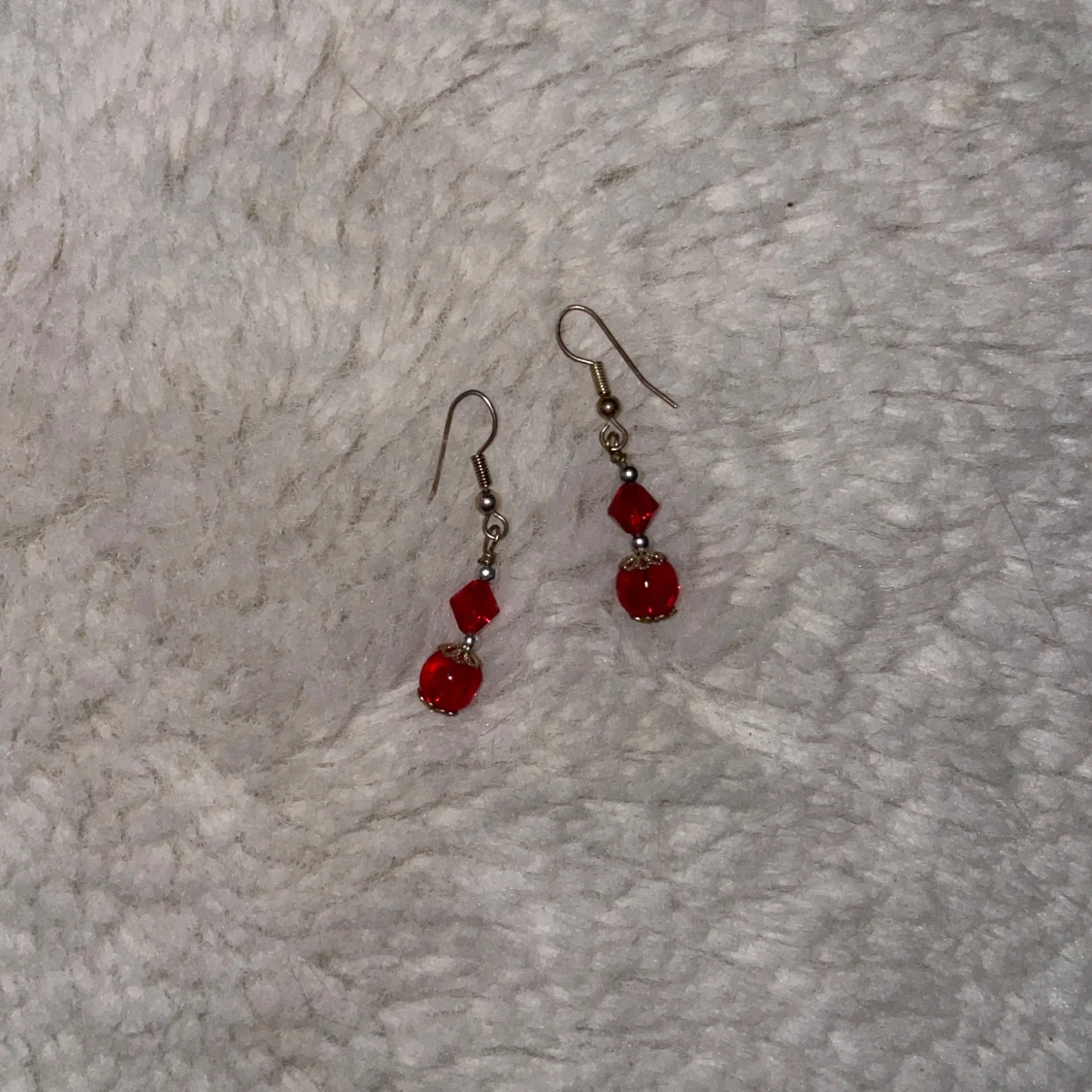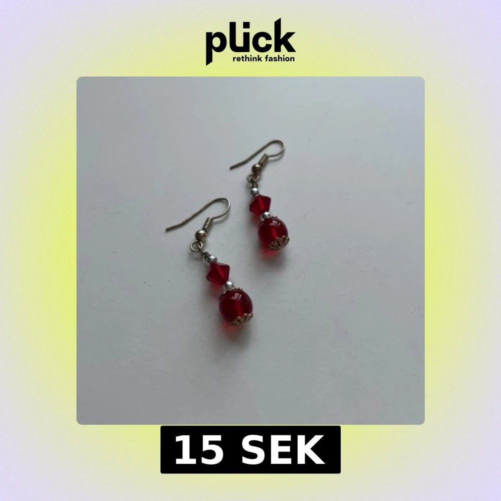 Snygga örhängen med röda pärlor och silverfärgade detaljer. Hängande modell med en rund och en diamantformad pärla i rött, samt små silvriga kulor och dekorativa avslut. Perfekta för att ge din look lite extra färg.