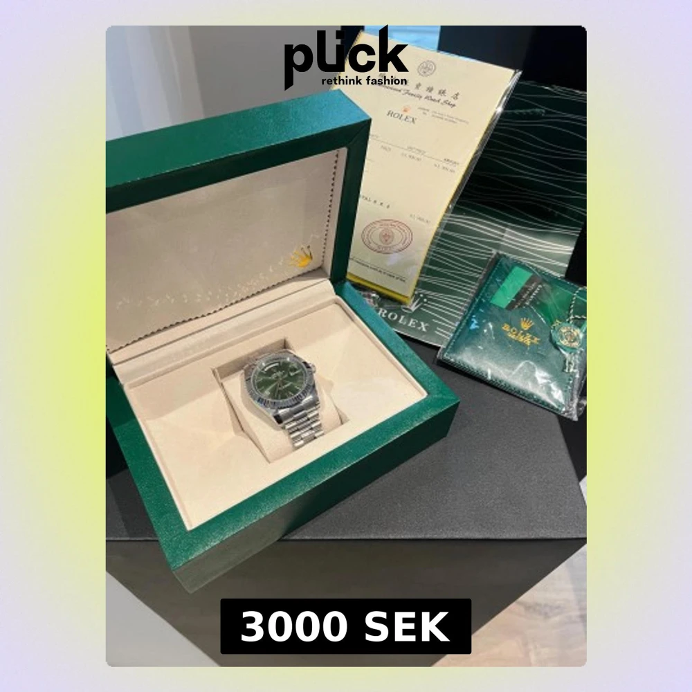 Säljer en riktigt snygg Rolex Day-Date med grön urtavla och klassisk räfflad bezel. Klockan har en länk i polerat stål och dag- och datumvisning. Kommer i originalbox med certifikat och tillbehör. Perfekt för dig som vill sticka ut med stil.