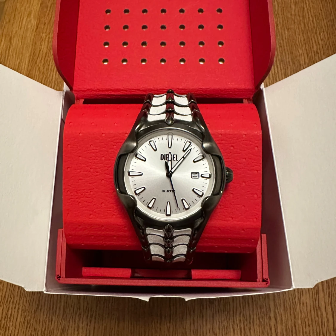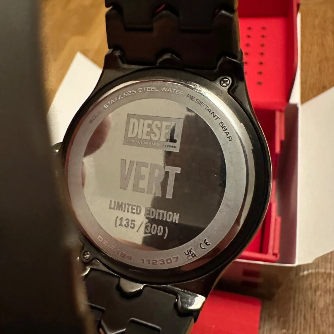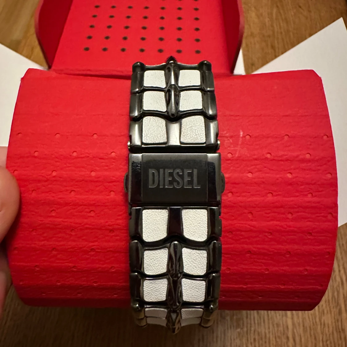 Säljer en Diesel Vert Limited Edition klocka, nr 135 av 300. Klockan har en rund silverfärgad urtavla med svart index och datumvisning. Armbandet är i rostfritt stål med unikt mönster i silver och svart. Snygg och modern design, perfekt för dig som gillar statement-accessoarer.