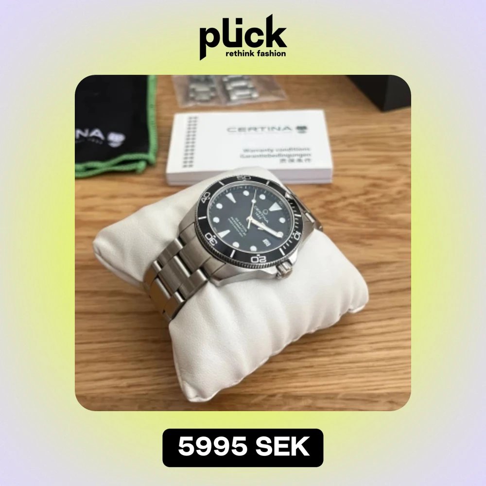 Certina Ds Action Diver från Certina har en diameter på 38 mm och utrustad med ett automatiskt urverk. Urtavlans färg är svart, skyddad av reptåligt safirglas. Klockan kommer med en elegant och bekväm metallänk. Allt og medföljer. Fint skick 7.5/10.