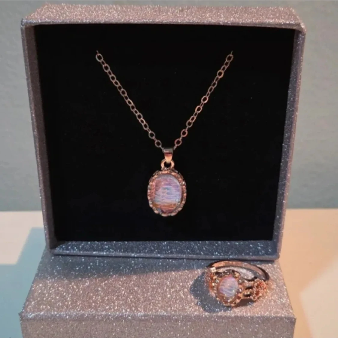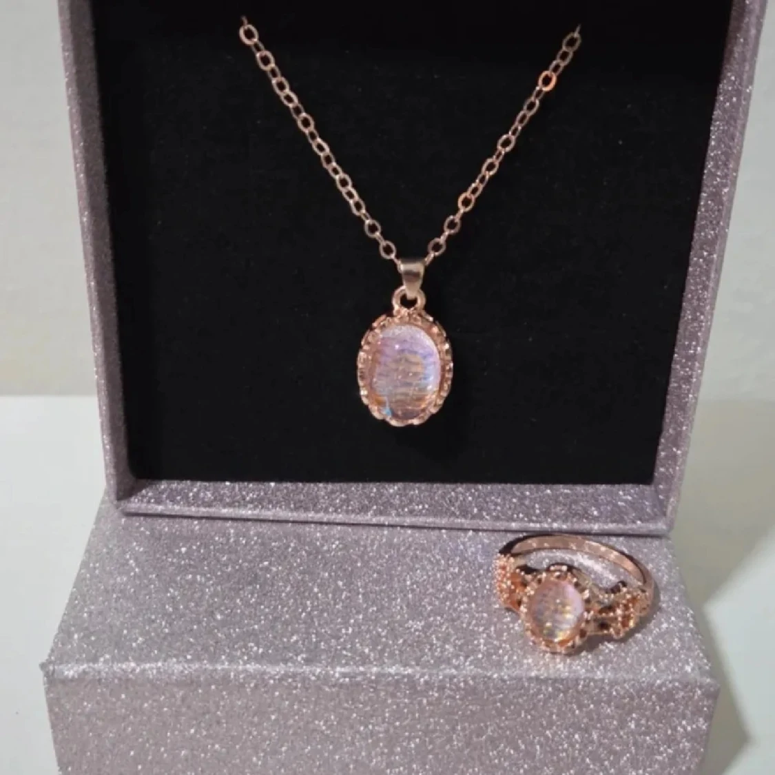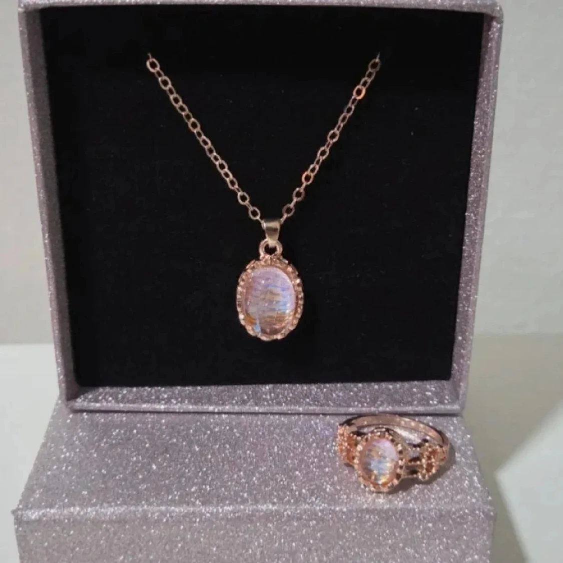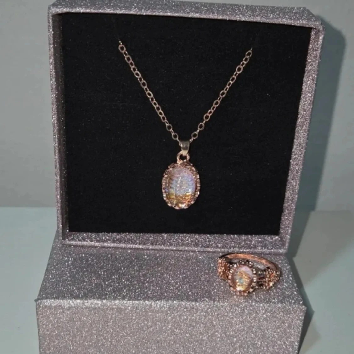 Säljer ett snyggt smyckeset med halsband och matchande ring i roséguld. Båda har en oval, skimrande sten i mitten omgiven av små glittriga detaljer. Kedjan är tunn och elegant, och ringen har samma stendesign. Perfekt för dig som gillar unika accessoarer. Halsbandet är ca 48 cm långt och ringen är 16.5 (Storlek 6)