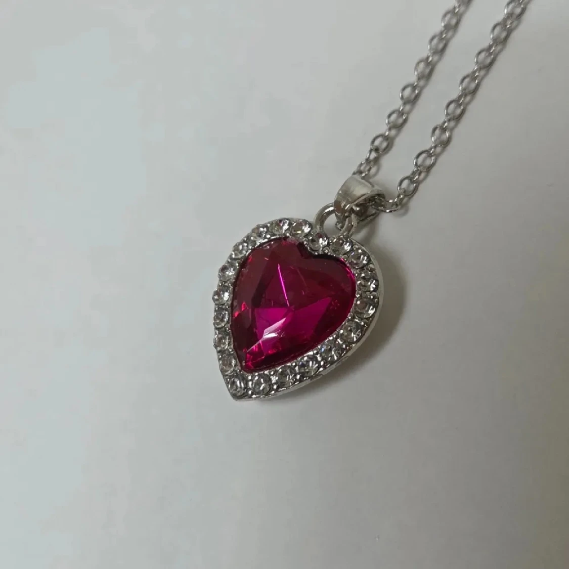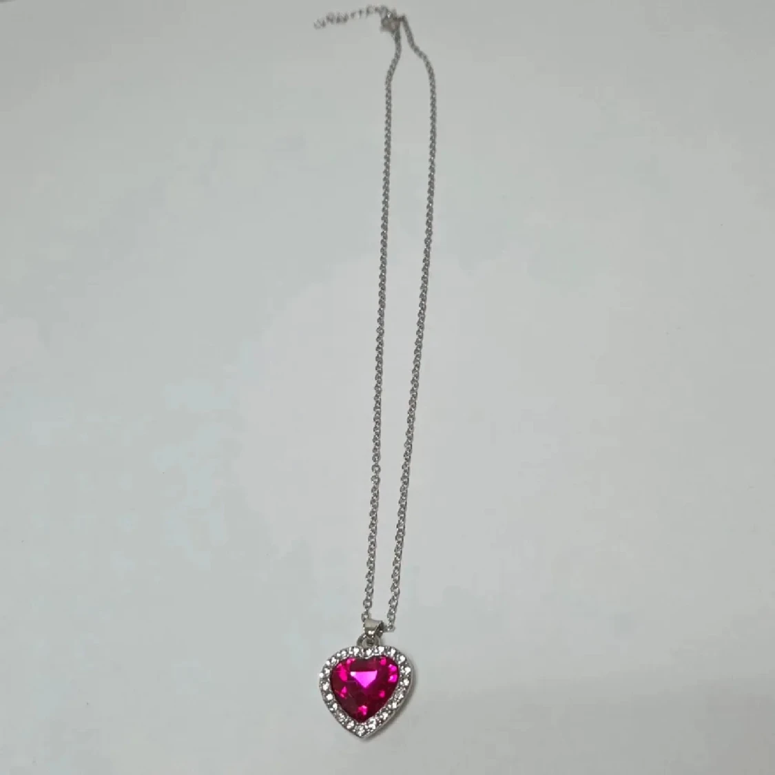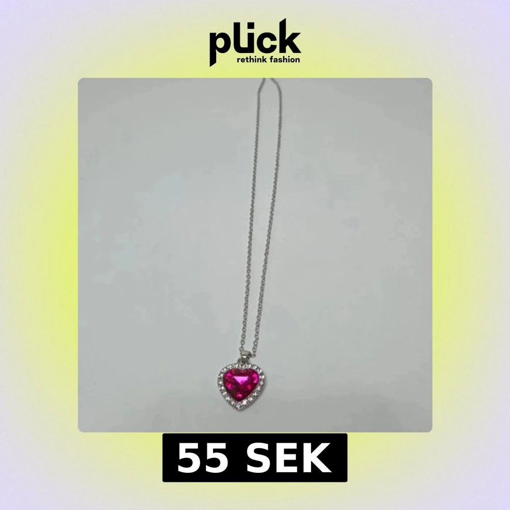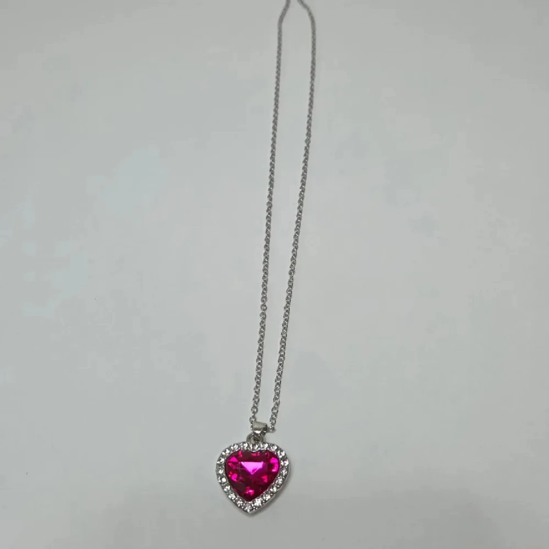 Snyggt halsband i silverfärg med ett hjärtformat hänge. Hänget har en stor rosa glittrig sten i mitten, omgiven av små klara stenar som ger extra bling. Baksidan av hänget är texturerad i silver. Perfekt accessoar för dig som gillar statement-smycken.