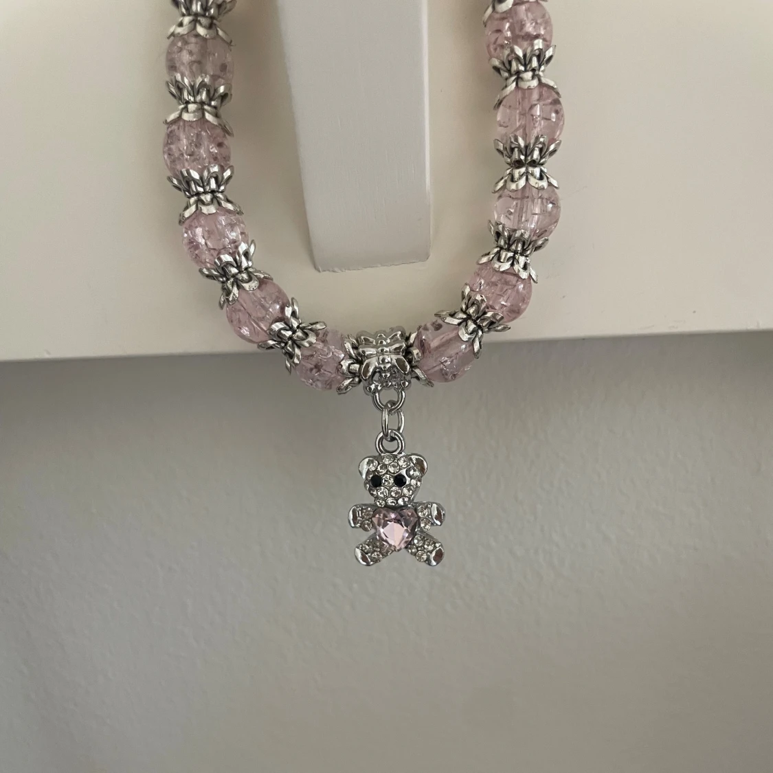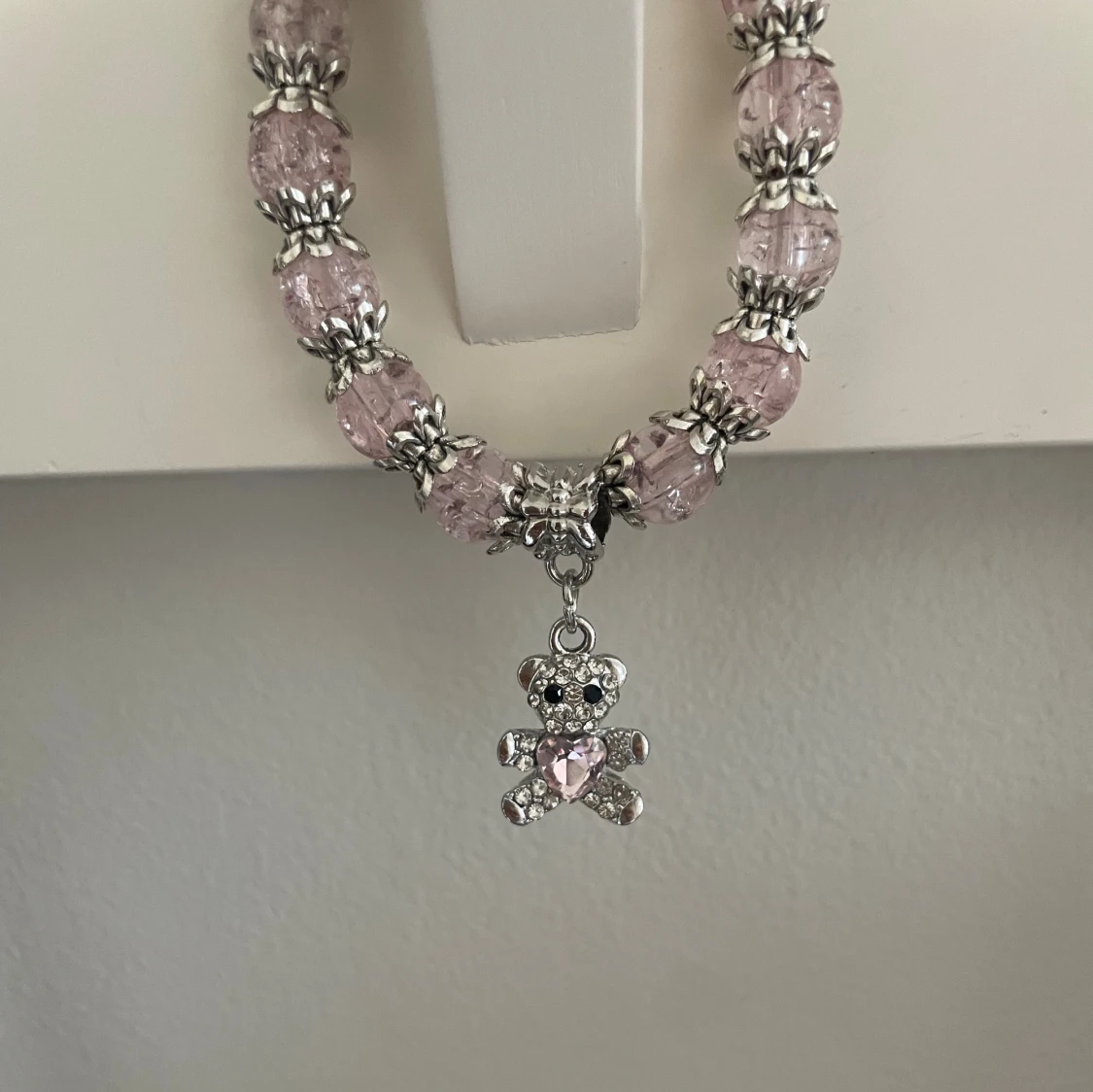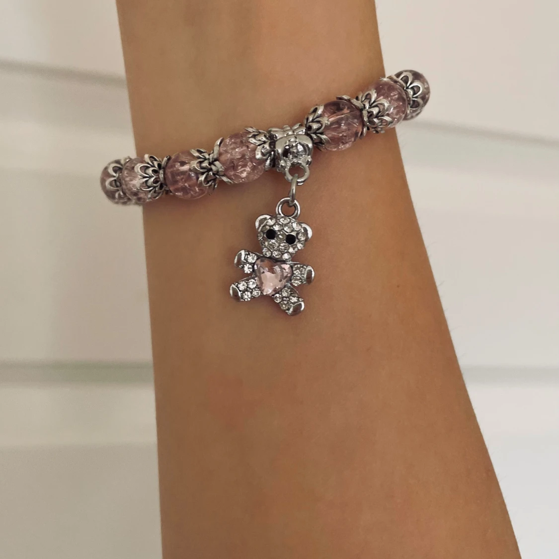 Supergulligt armband med stora ljusrosa pärlor och detaljer i silverfärg. Armbandet har ett glittrigt björnhänge med små stenar och ett hjärta i rosa på magen. Perfekt accessoar för dig som vill sticka ut med något sött och unikt.