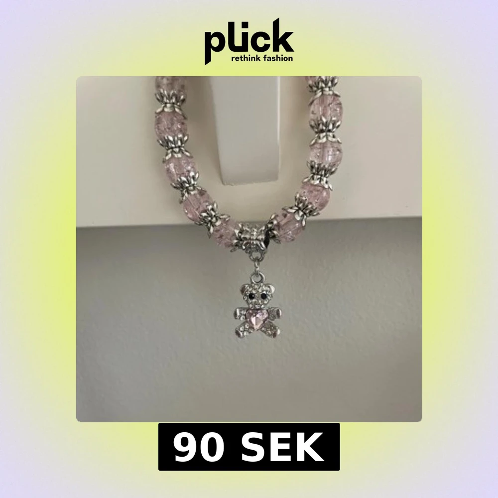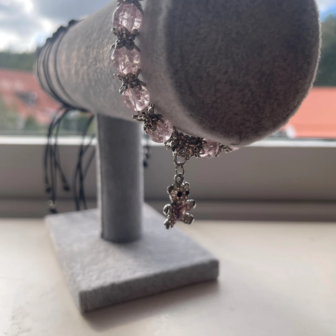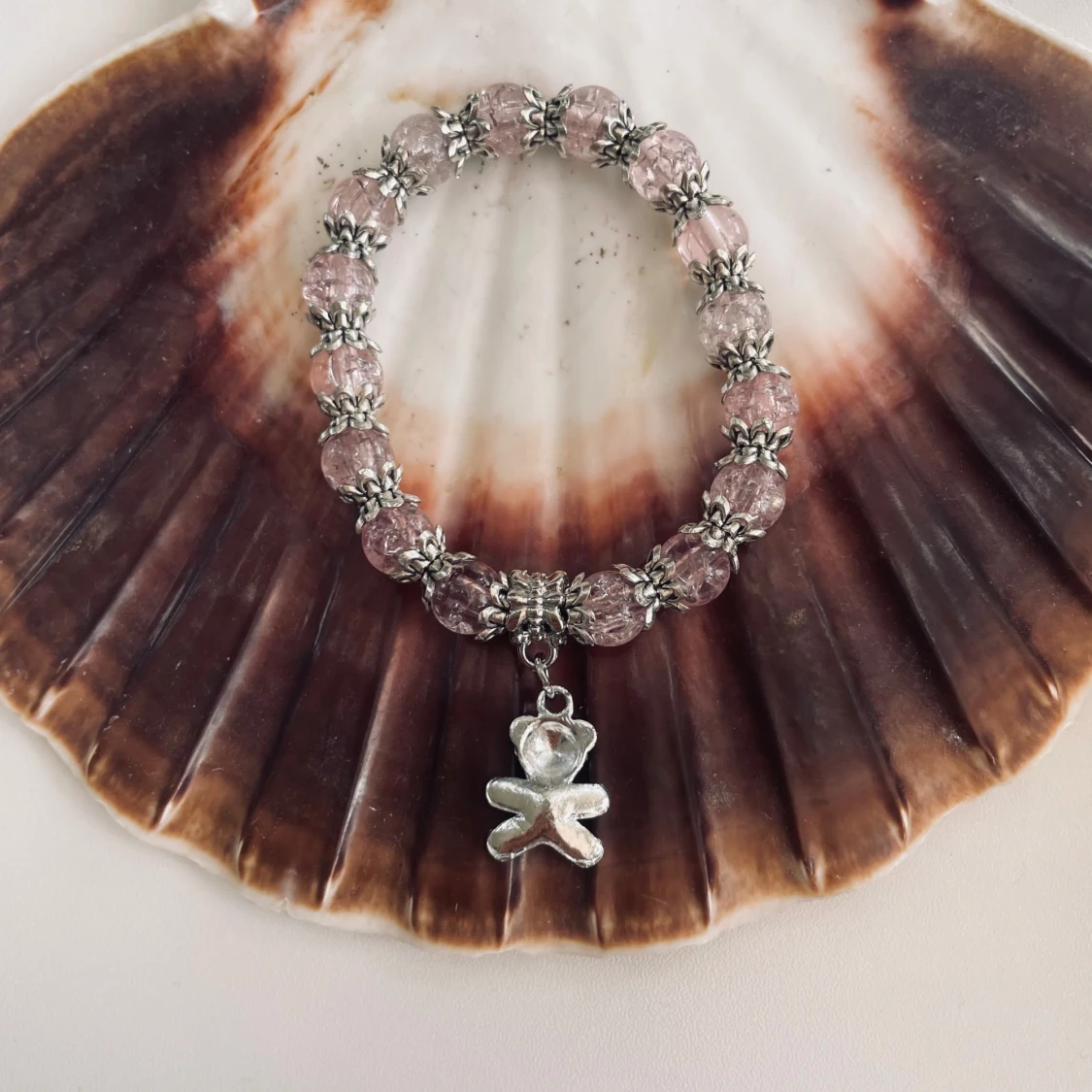 Supergulligt armband med stora ljusrosa pärlor och detaljer i silverfärg. Armbandet har ett glittrigt björnhänge med små stenar och ett hjärta i rosa på magen. Perfekt accessoar för dig som vill sticka ut med något sött och unikt.