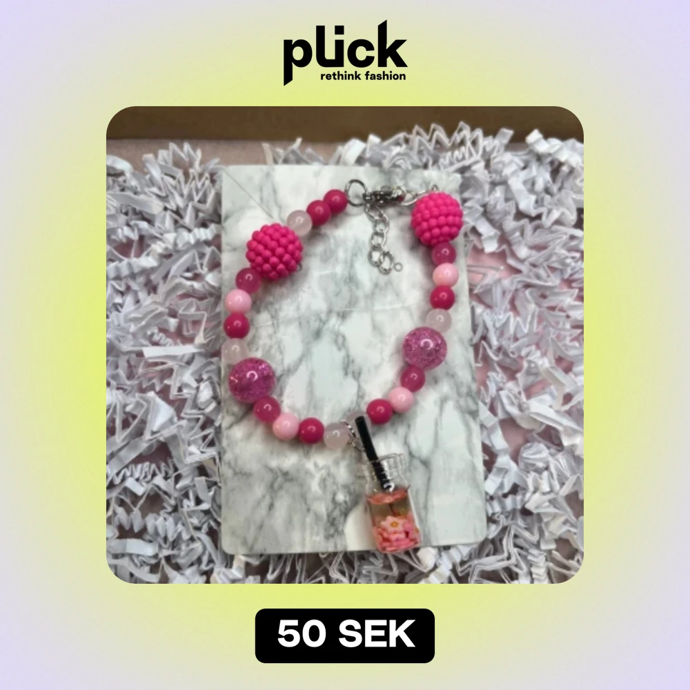 Ett rosa armband med en berlock och med kedja, så armbandet går att justera