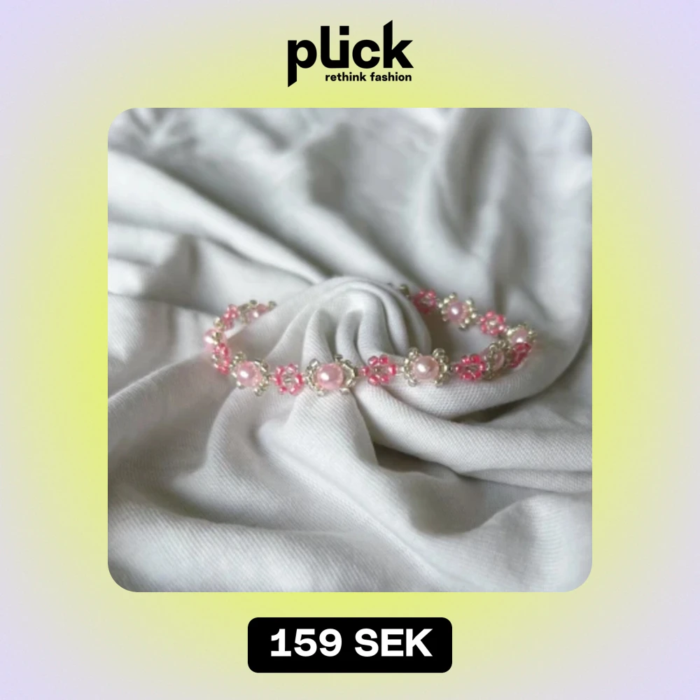 Handgjort armband med rosa blommor och silvriga/ljusrosa deltaljer.