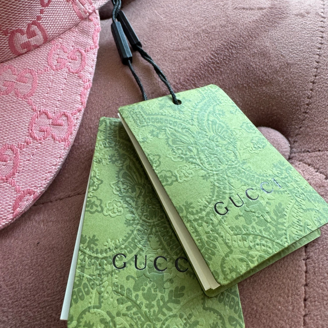 Snygg rosa keps med ikoniskt GG-mönster över hela kepsen. Justerbar rem bak i rosa läder och guldfärgad detalj. Tillverkad i bomullstyg med exklusiv känsla. Perfekt för dig som vill sticka ut med en lyxig accessoar.