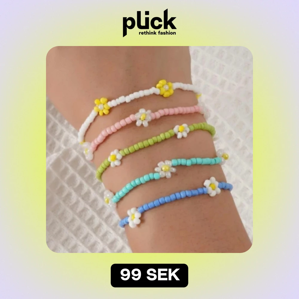 Säljer ett set med superfina pärlarmband i olika färger. Varje armband har små blommor som detaljer, vilket ger en söt och somrig känsla. Färgerna är vit, rosa, grön, blå och gul. Perfekt för att liva upp vilken outfit som helst!