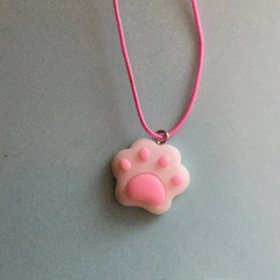 Sött halsband med en rosa tassformad berlock. Berlocken hänger på ett rosa snöre och ger en lekfull touch till din stil. Perfekt för djurälskare eller som en rolig accessoar.