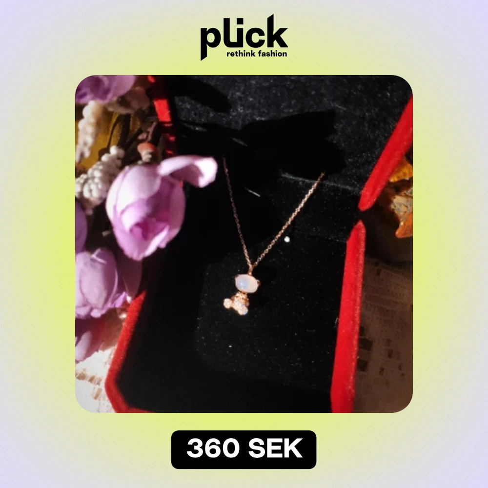 Halsband gjord av 100% sterlingsilver med rosguldfärgad coat. Björnens huvud är gjord av en vitjade pärla och kroppen är smyckad med Swarovskikristaller.