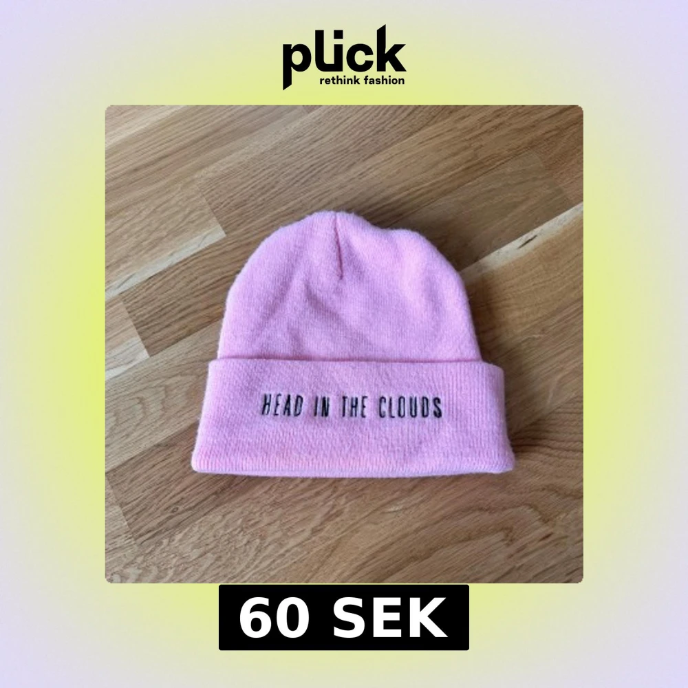 Säljer en ljusrosa stickad mössa med svart broderad text 'HEAD IN THE CLOUDS' på framsidan och 'ARIANA GRANDE' på baksidan. Äkta Ariana Grande merch från the honeymoon tour. Jättebra kvalité!
