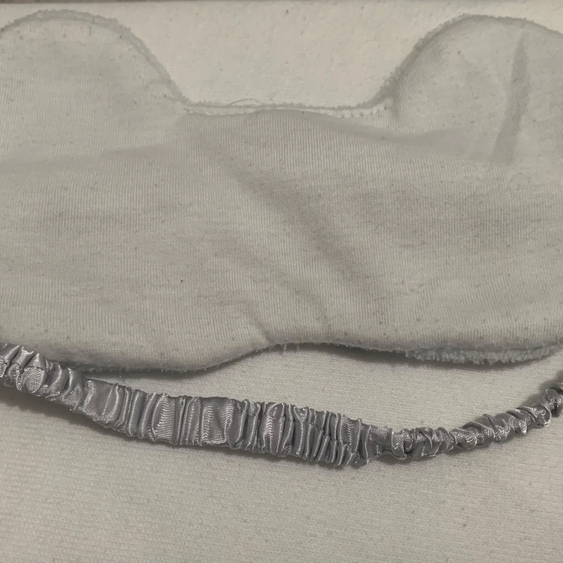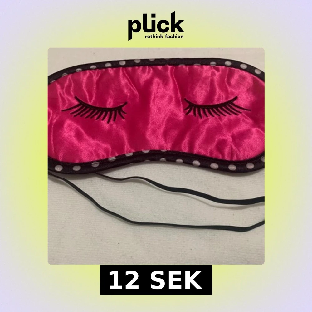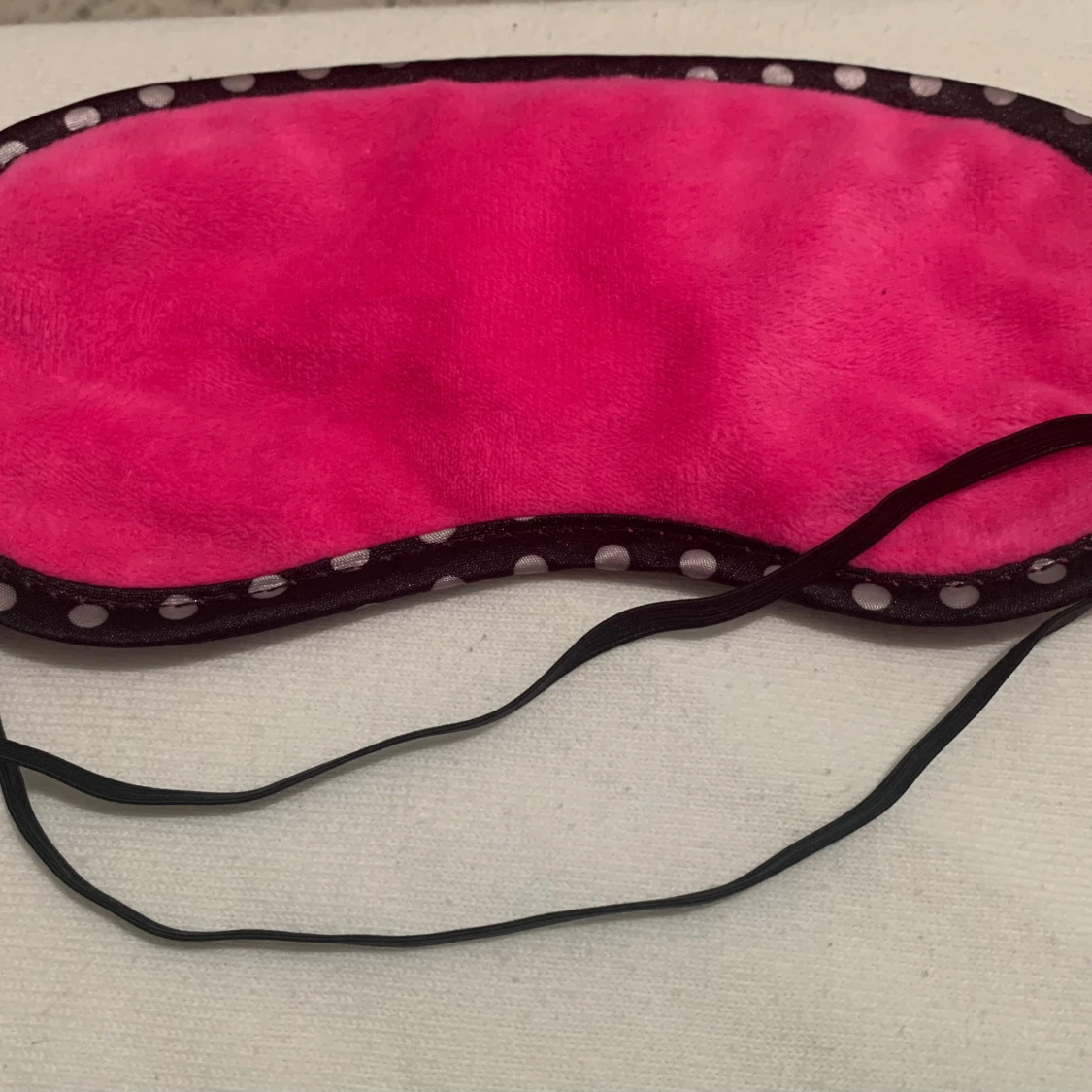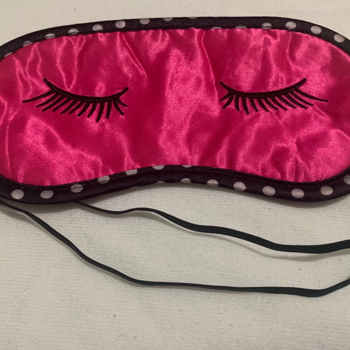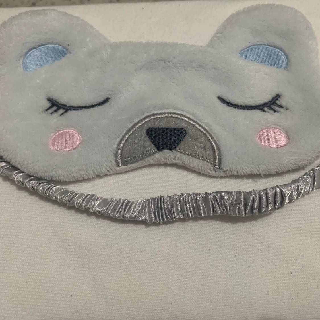 Två olika sovmasker: en rosa i satin med svarta broderade ögonfransar och prickig kant, samt en grå plyschmask i form av en björn med broderade detaljer och öron. Båda har elastiska band för att sitta bekvämt på huvudet.