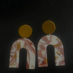 Superfina örhängen i polymerlera, som inte tynger med öronen. Studsen är i ljus orange medan bågarna skiftar i rosa och vitt. Aldrig använda och desinfekteras innan avfärd.