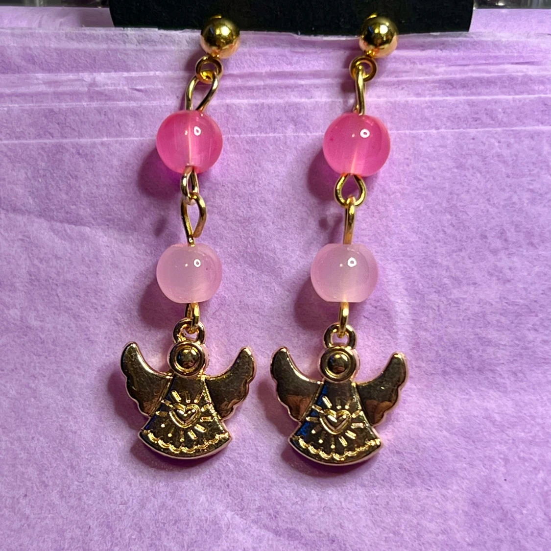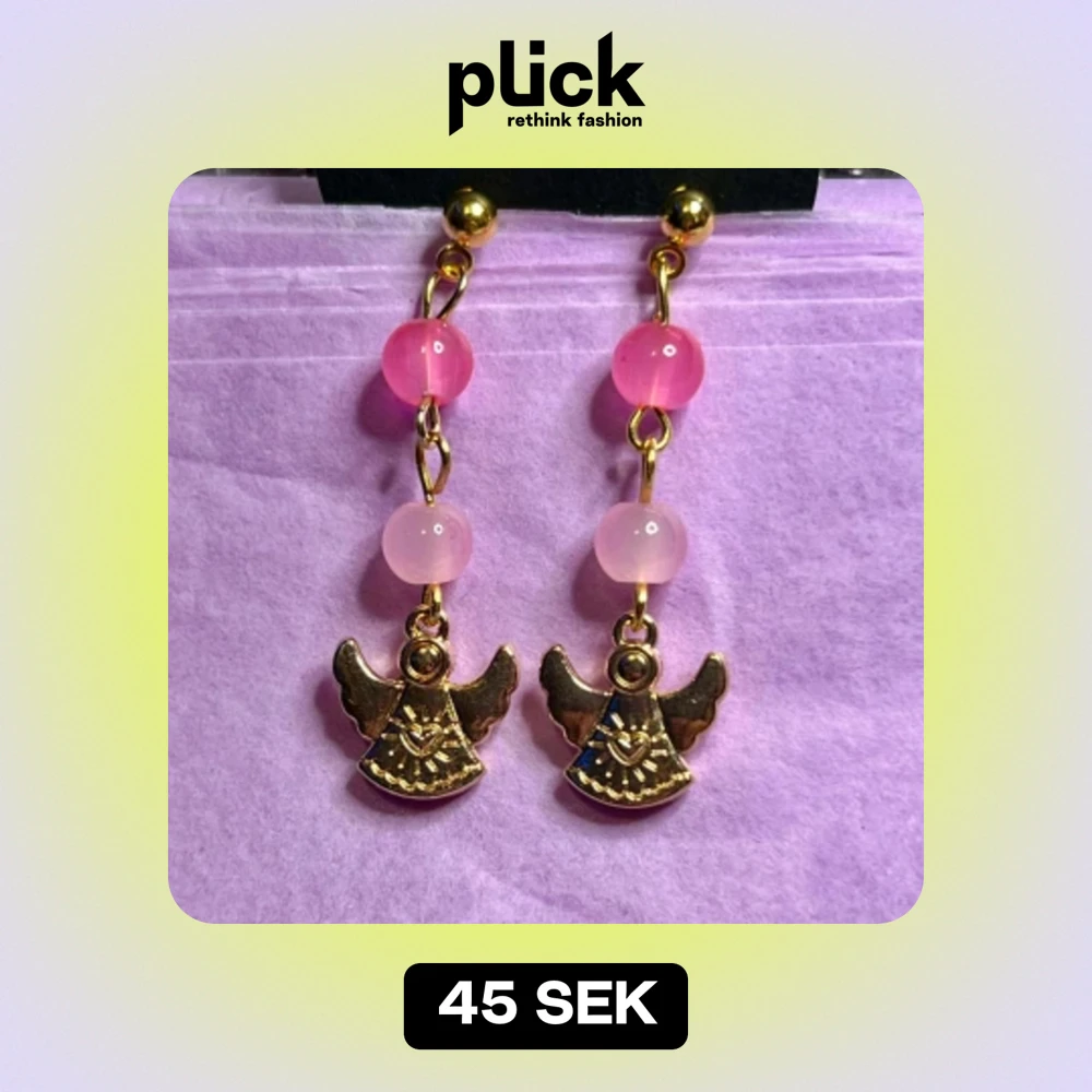 Söta guldiga örhängen med änglar och rosa pärlor. Gjorda av mig. I rostfritt stål💕🪽