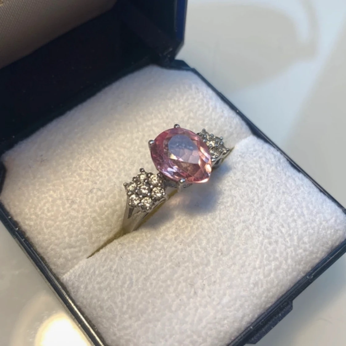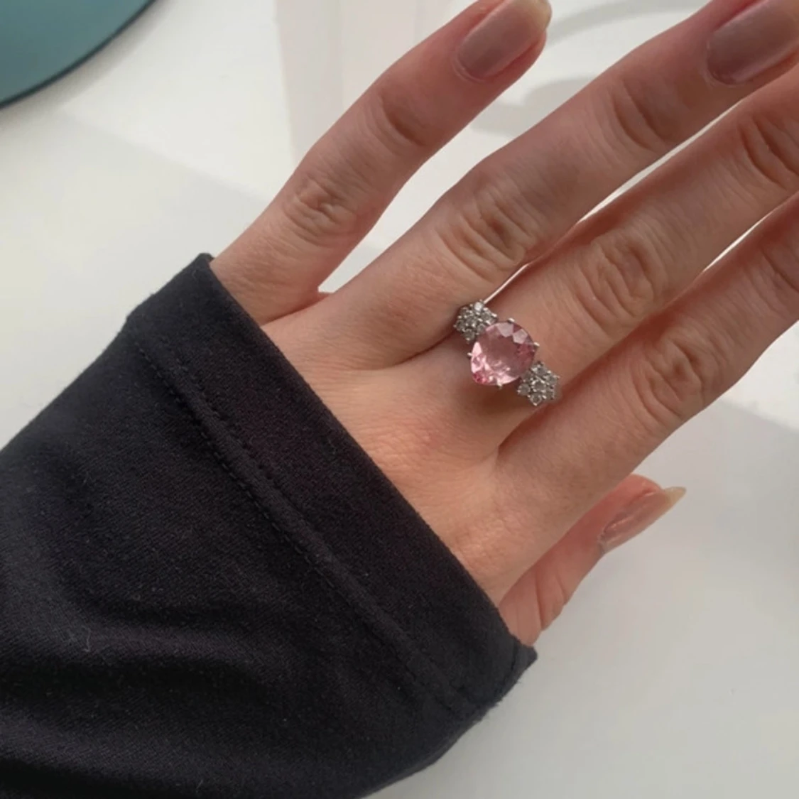 Väldigt fin ring i rostfritt stål med en ljusrosa glas zirkon och små glas-kristall blommor 🌸💕