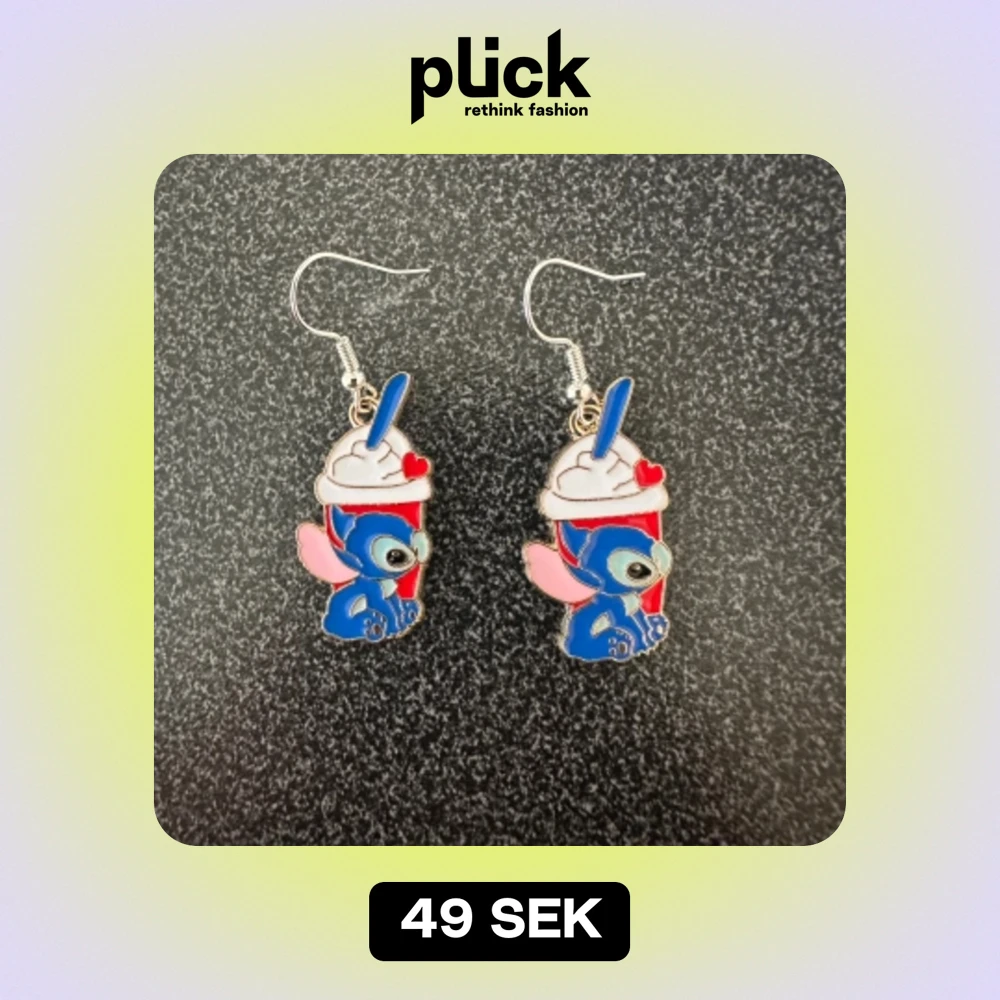 STITCH som håller en milkshake. Örhängena har detaljer i blått, rött, vitt och rosa. krokarna är inköpta som nickelsäkra.
