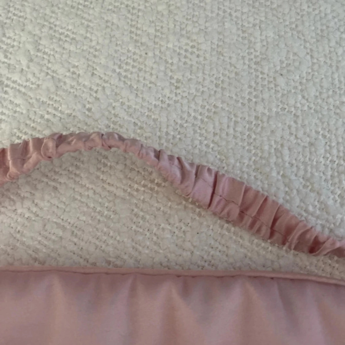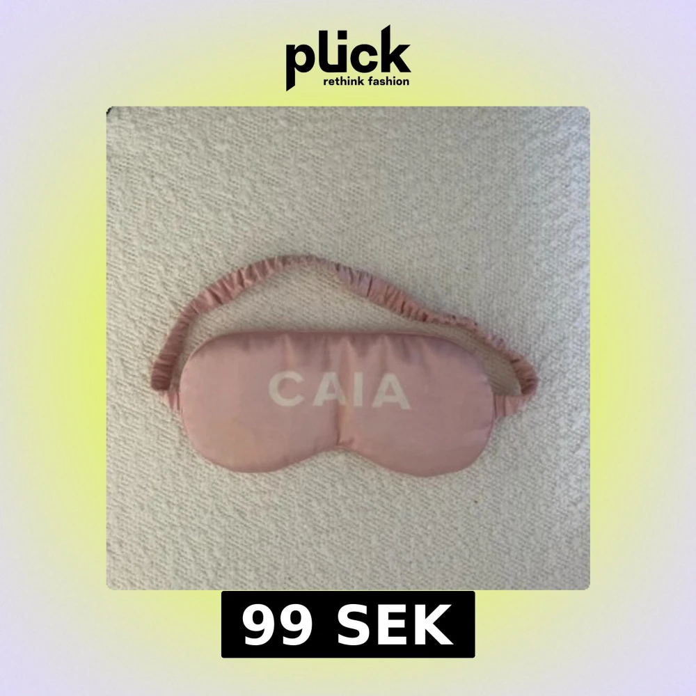 Säljer en rosa sovmask från CAIA med bred resår och mjuk, glansig yta. Masken har en enkel design med CAIA-loggan tryckt framtill och är tillverkad i ett silkesliknande material som känns skönt mot huden.