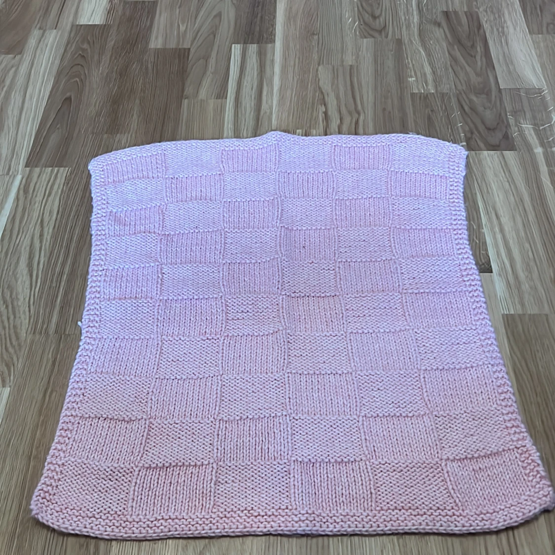 Mysig rosa stickad filt med rutmönster. Perfekt för att hålla sig varm under kyliga kvällar. Den har en mjuk och bekväm känsla.